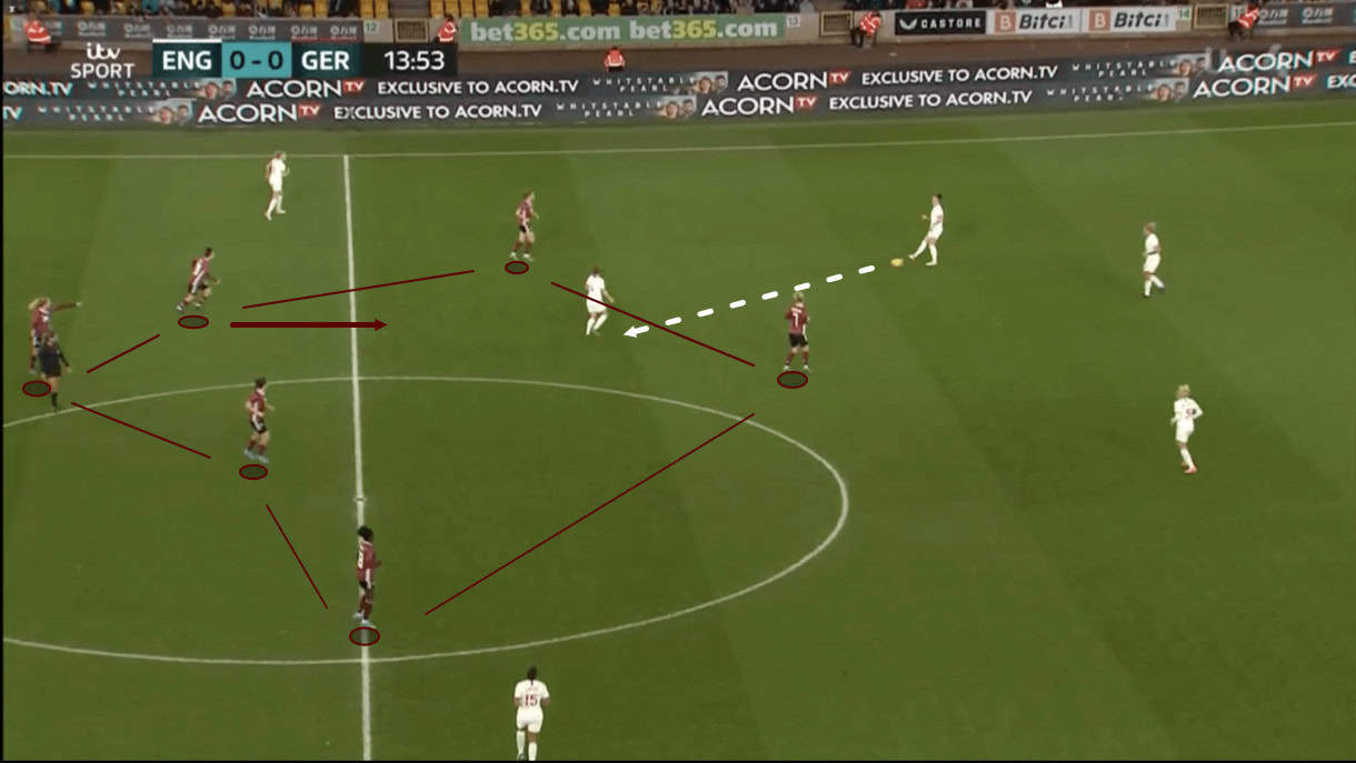 The organised and aggressive pressure on the ball carrier here leaves her with little choice but to send the ball backwards, triggering Germany’s press to push up and squeeze the opposition even more, which we see as we progress into figure 12.