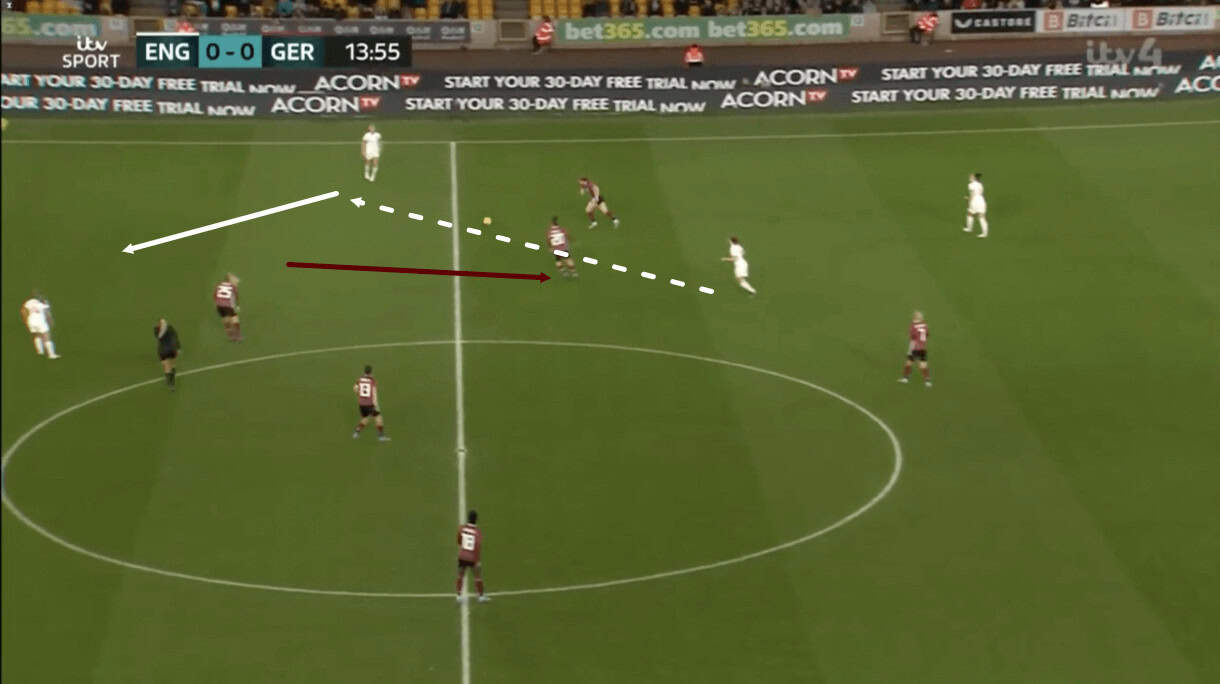Firstly, figure 13 shows England playing the ball to a free woman in midfield behind Germany’s centre-forward, alongside the left-winger and in front of the left central midfielder. Nobody immediately picks this option up, allowing her to receive and turn with freedom before the left central midfielder eventually pushes up and tries to close her down.