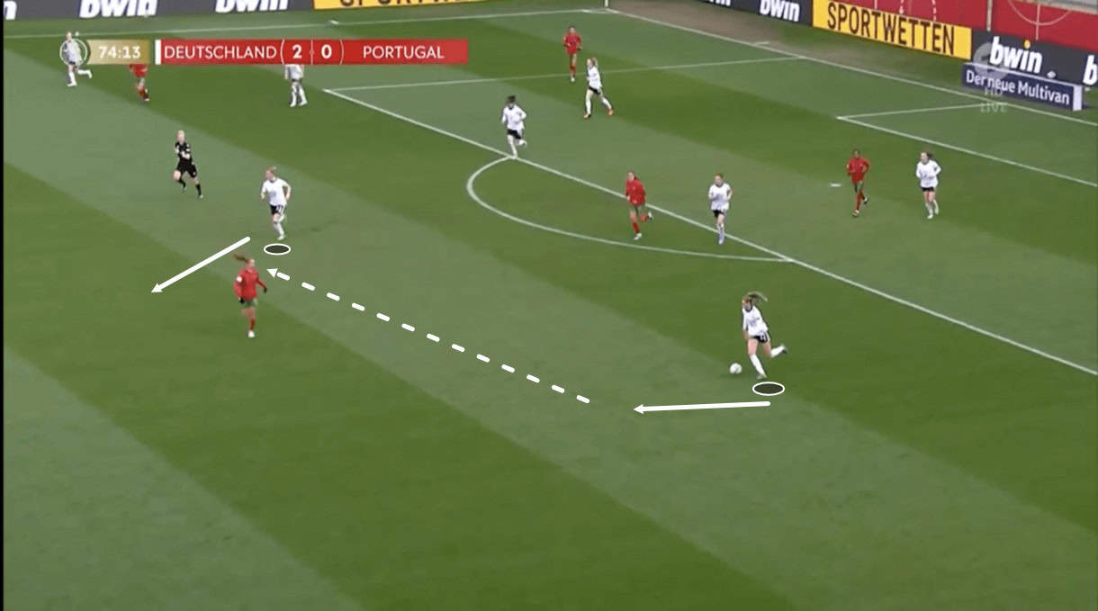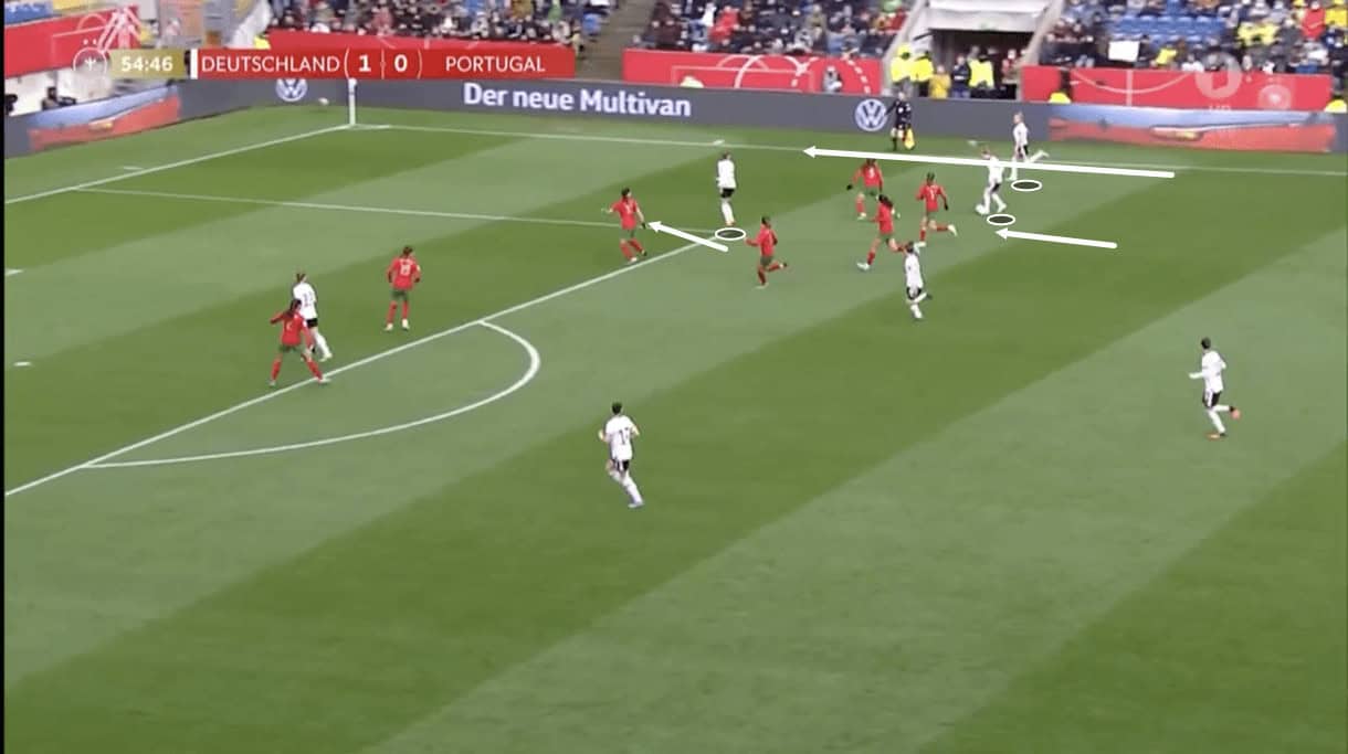 That midfielder then ends up attracting plenty of attention from opposition players as she enters the middle third of the pitch but Portugal’s pressure isn’t good enough to stop the ball carrier from threading a wonderfully-timed and well-weighted through ball into the striker’s in-to-out running path, again showing how Germany’s players are very familiar with each other’s movement in this team, with the midfielders well aware of how and where their attackers will typically go as they look to break beyond the opposition’s backline. So, some intelligent decision-making, good technical play and familiarity with one another helped Germany to get out of their own half and into the opposition’s in this passage of play and Voss-Tecklenburg will be relying on these qualities from her players if they’re to produce some successful transitions in the Euros. Germany can hurt teams in this phase of play but it relies on the aforementioned qualities.