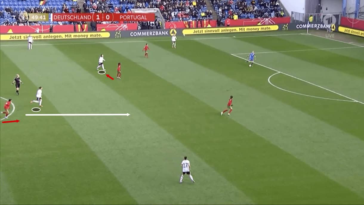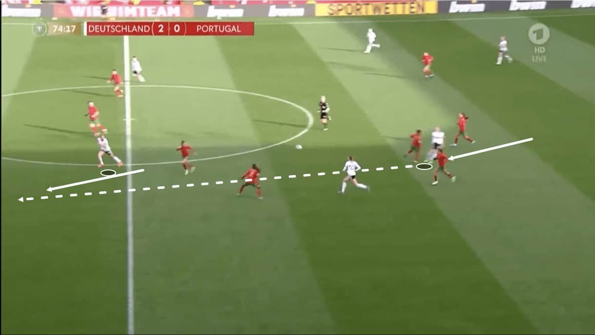 As play moves on from here, we see the ball carrier actually take up the option offered to her by her midfield teammate as she plays her through in the centre to continue Germany’s progress through Portugal’s midfield in transition.