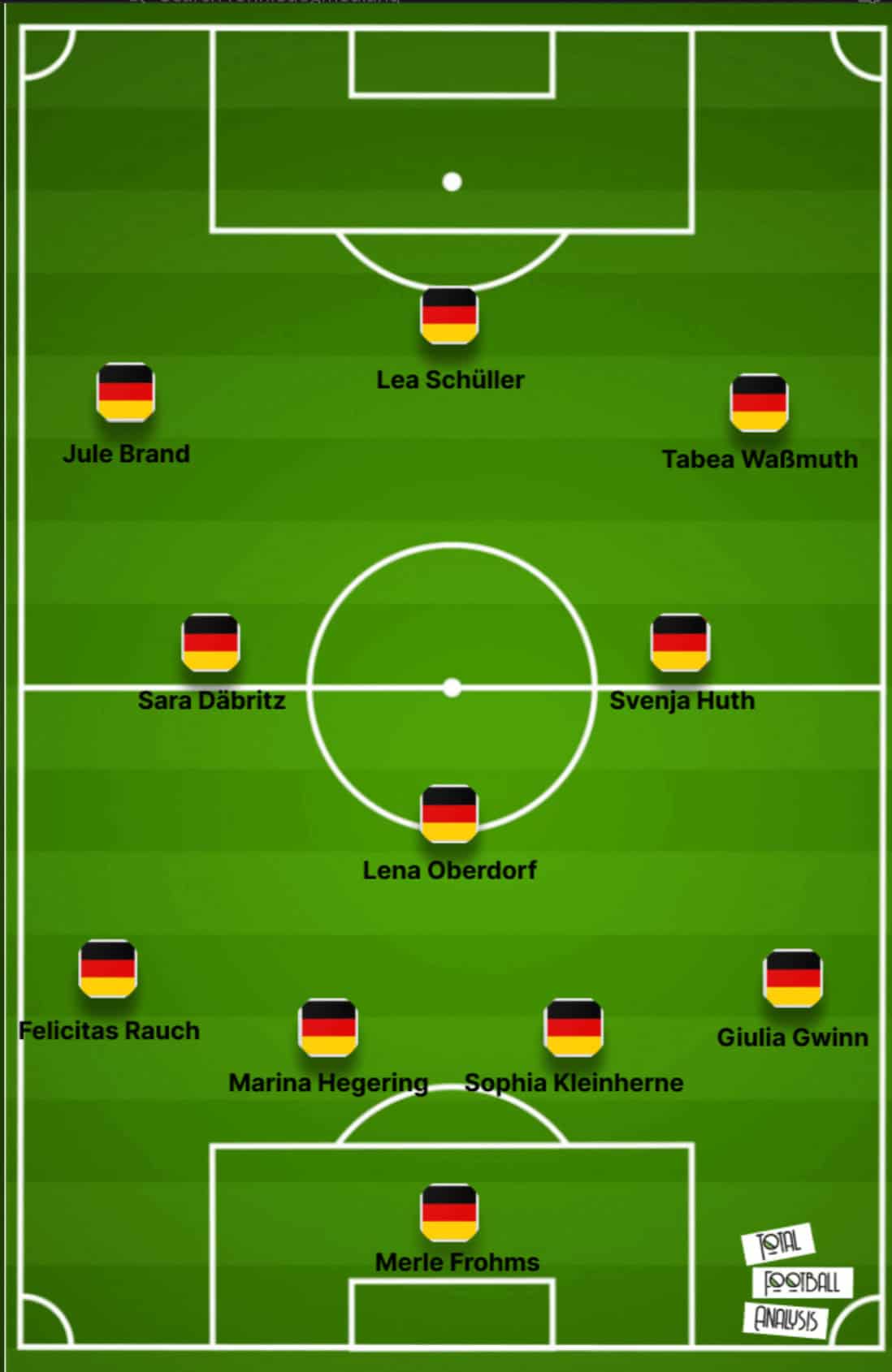 We’ve put a midfield three of Wolfsburg duo Lena Oberdorf (holding) and Svenja Huth along with former PSG player Sara Däbritz in the heart of Die Nationalelf. This was a tough area of the pitch to decide on but we feel Oberdorf offers more than any other player as the holding midfielder to cover for her teammates defensively and control play along with Däbritz, who offers another solid option in possession and will likely be given a little more freedom to roam forward with the ball, though not as much as Huth, who we imagine will be the main creative force of this midfield operating in the right half-space and aiming to get into crossing positions from there quite frequently.