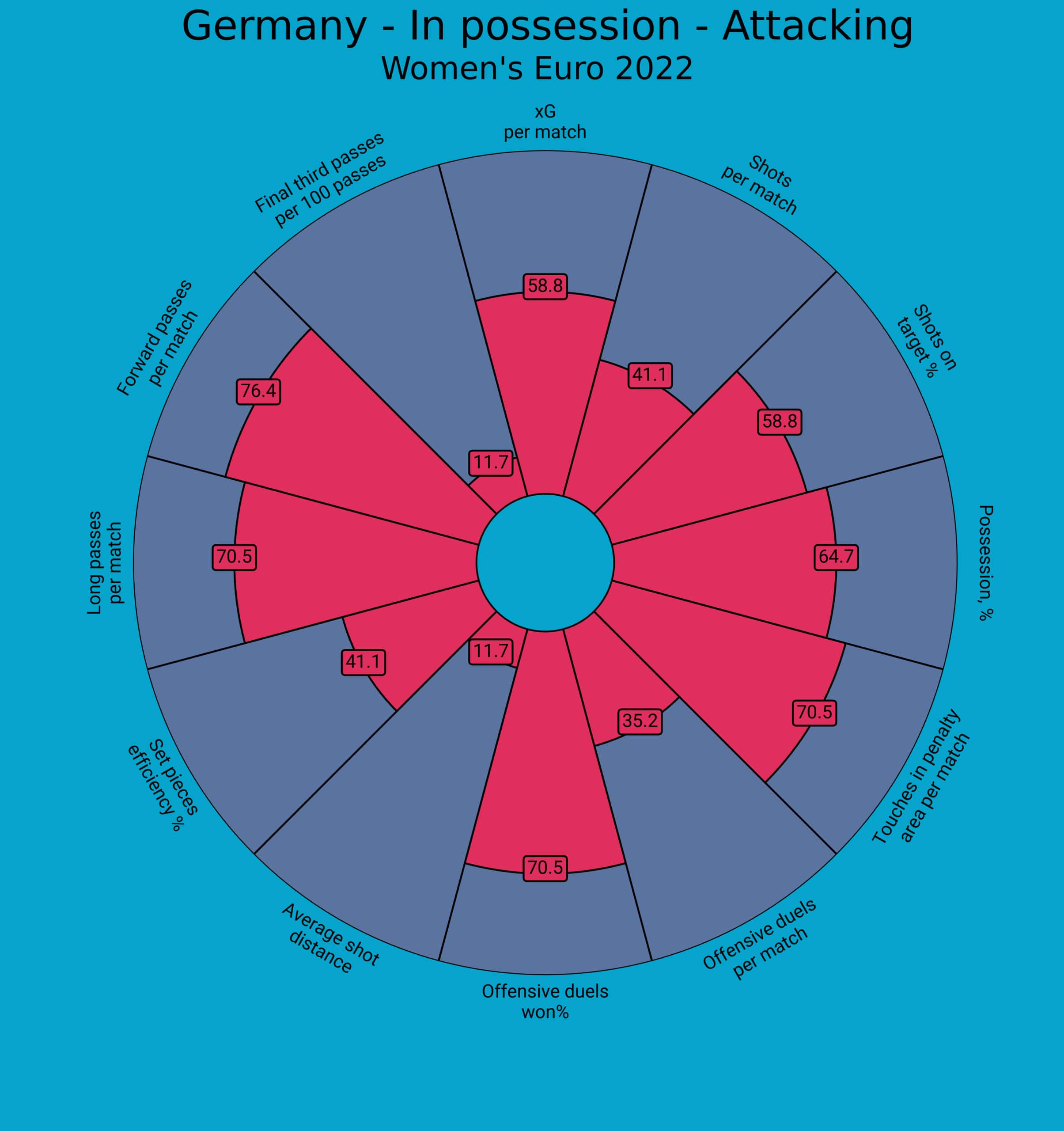 Firstly, let’s use this offence-focused pie radar in figure 3 and see what it tells us about Germany’s attacking style of play. It’s evident that Germany like to dominate the ball but they also like to get the ball forward with great regularity and play vertically, as is evident from their high percentile ranking in forward passes per match. They tend to take few long shots, instead working the ball into high-xG shooting positions and are generally quite efficient with their shooting in terms of accuracy as a result.