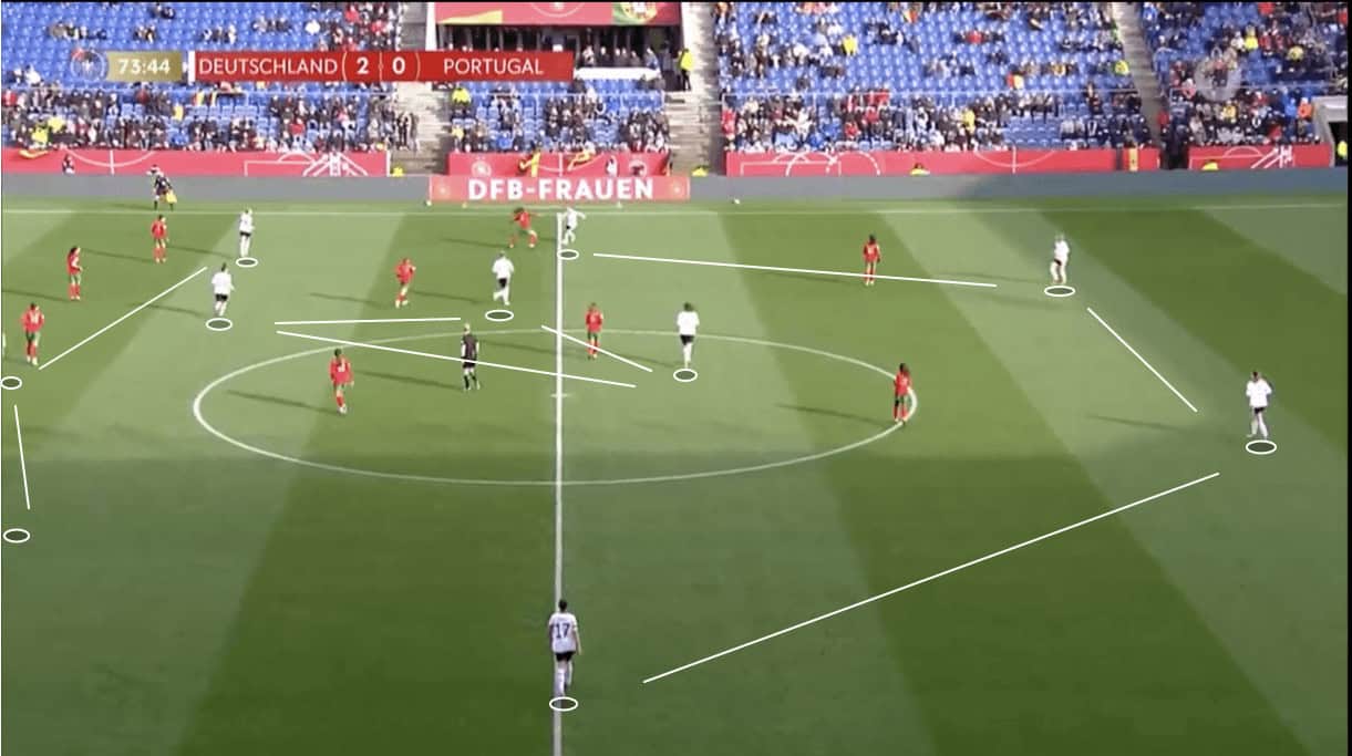 We see an example of Germany facing up against a high-pressing Portugal in figure 6 and we see one Portugal player, in particular, marking Germany’s holding midfielder tightly. This can, of course, happen at times during the build-up and as we alluded to earlier, it’s common to see one of Germany’s ‘8s’ (it would be Däbritz more often in our starting XI) dropping in beside the holding midfielder to support her and provide another option for the goalkeeper and centre-backs. We see an example of this in figure 6. This is an intelligent way that Die Nationalelf look to break the opposition’s press even when facing off against a very well-organised and intelligent pressing system.