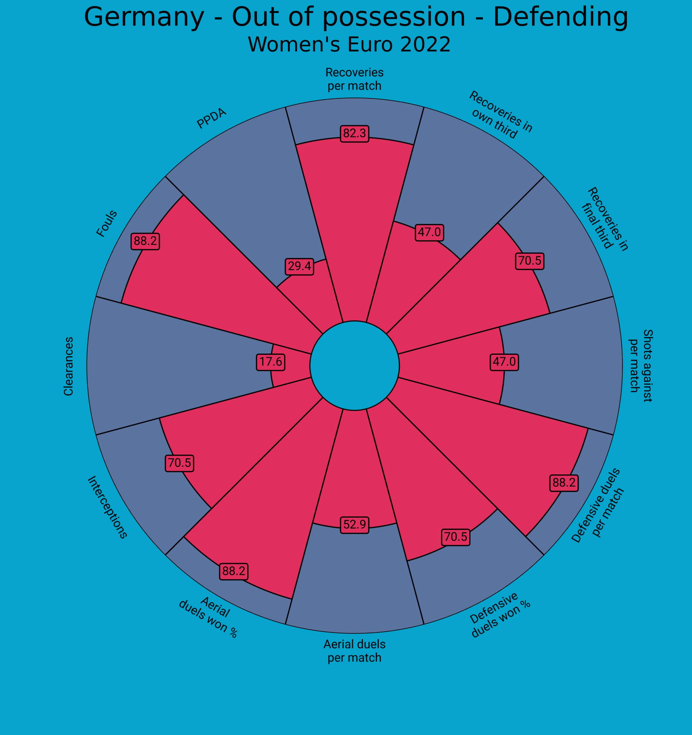 Next up, we’ll look at Germany’s performance in defensive phases of play. Again, we’ll first look at a pie radar (this time focusing on defence) and see what that tells us about Germany’s defensive style before then looking at some in-game examples to explain some points we feel relevant about Germany’s defence based on our video analysis.