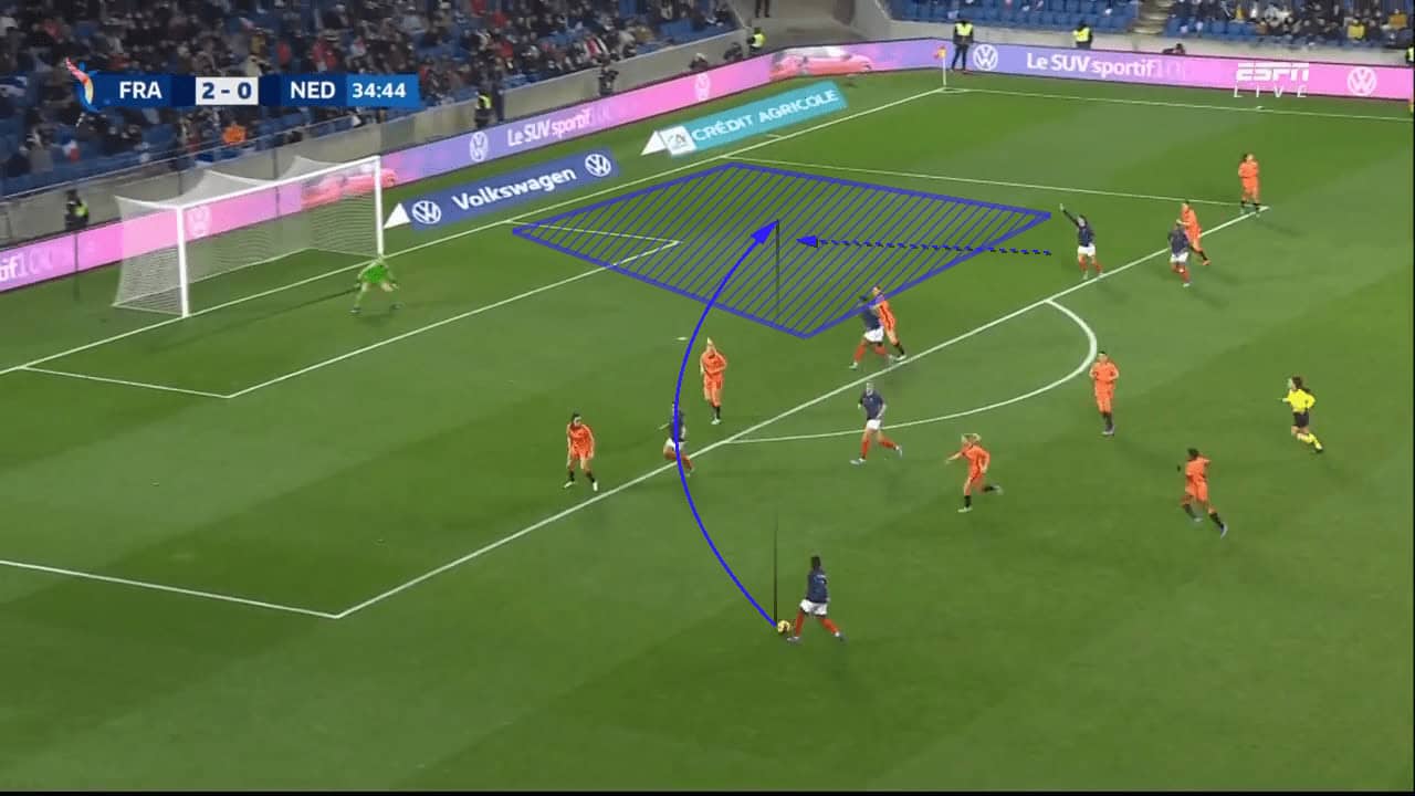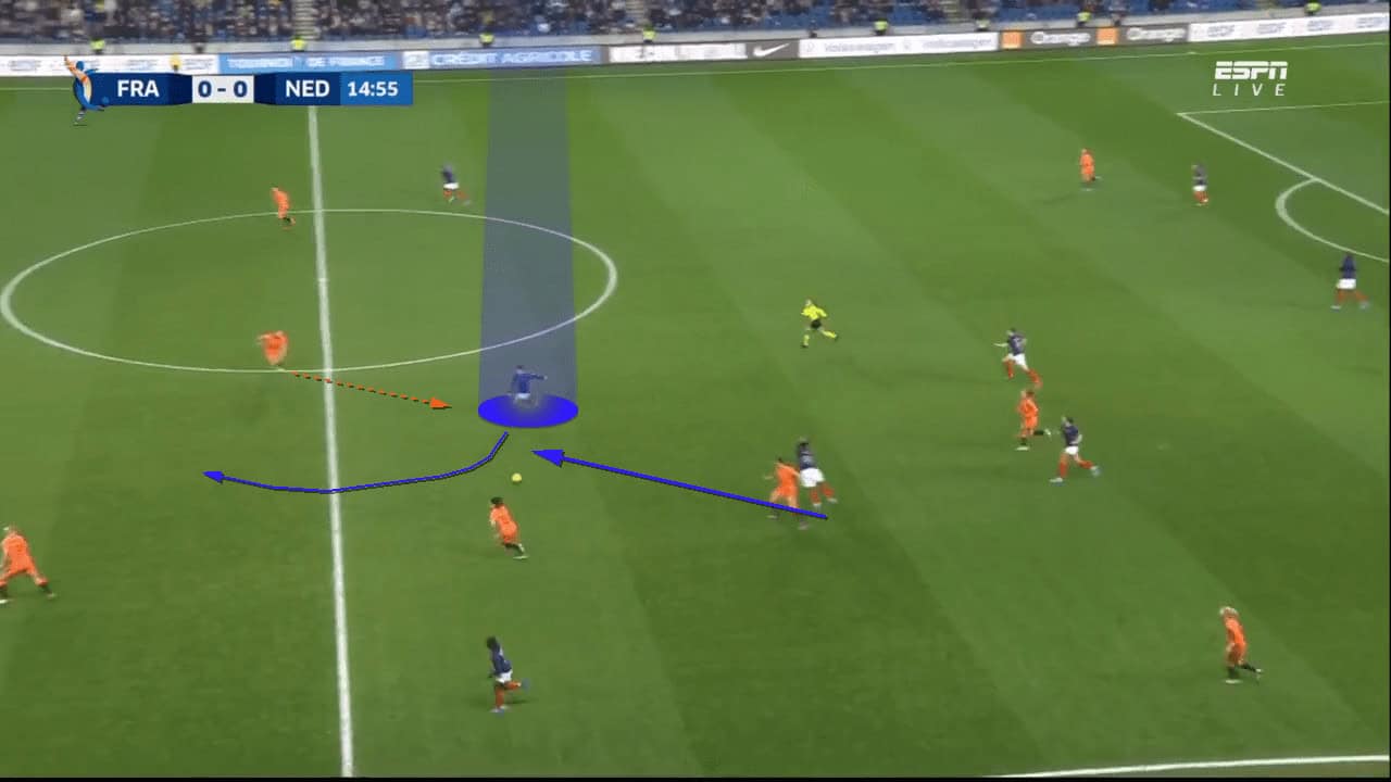 Yet again, perhaps due to the coach being quite new to the role, the Netherlands defenders are too slow and not aggressive enough to step into the opposition players before they receive the ball. In this image, the defender sprints at the ball only when the ball has already arrived at the French forward’s feet, meaning she has time to control the ball and turn, allowing her to easily dribble past the defender who has rushed out too late. Although that example did not prove costly, the Dutch defenders can’t afford to be so slow as it will continually leave the goalkeeper exposed to 1v1 situations in the long term.