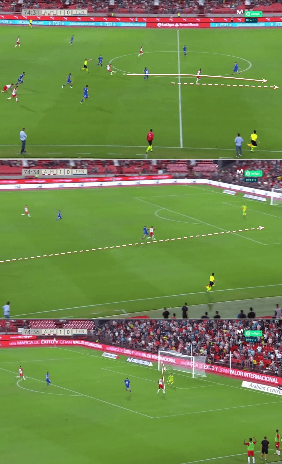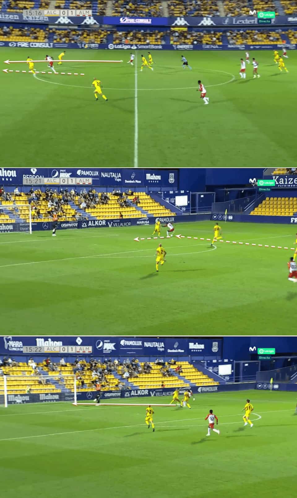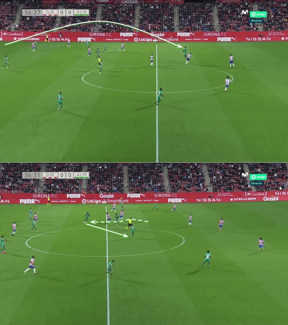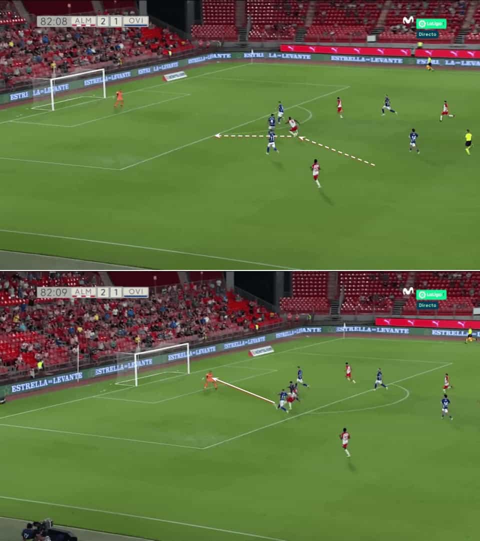 Again in the next example, Almería are very deep in their half and a pass in behind to transition into attack seems impossible. Grasping this, Sadiq comes deep to receive with his back to the goal and dragging a defender with him. With just one touch, he plays a good layoff into his teammate’s run and again accelerates the transition.