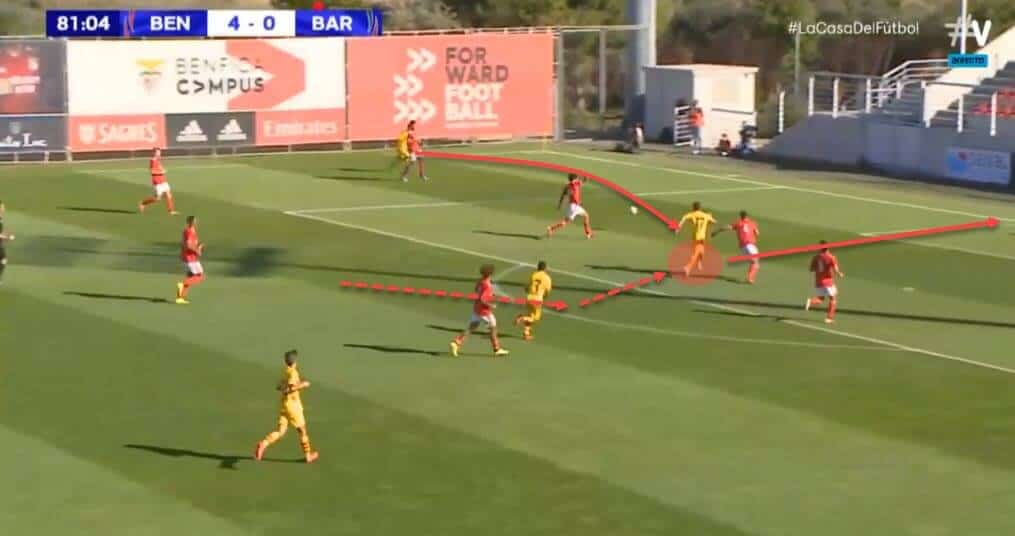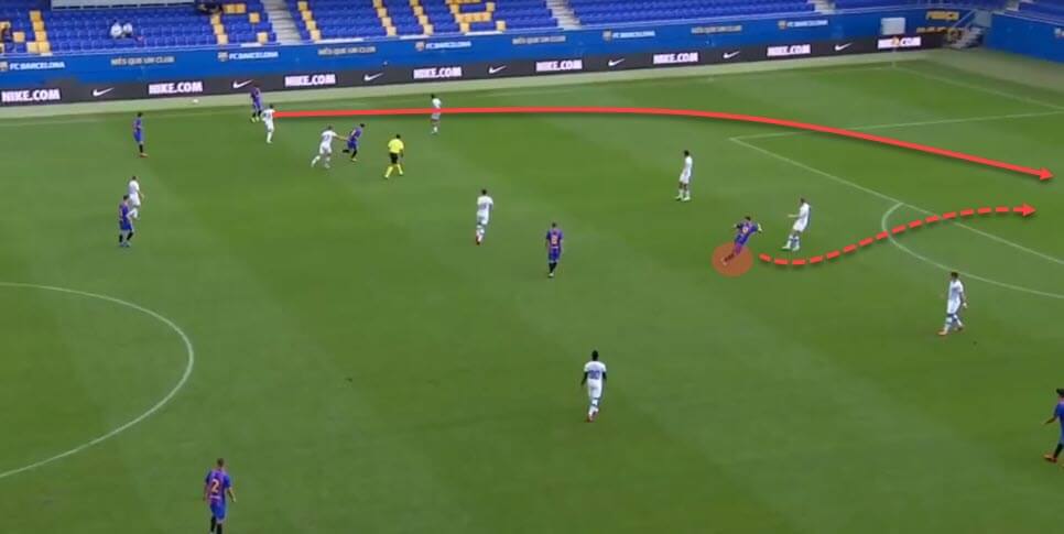 Again, we see Barbera in a deeper area, aiming to link up with his teammates during a transition. But it’s very interesting to note how he can receive in such an area and then run with the ball forward before deploying a very good pass into the feet of another player. This sequence sadly doesn’t end in a goal for Barcelona but it still showcased Barbera’s skillset quite well.
