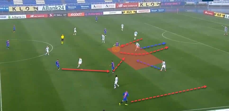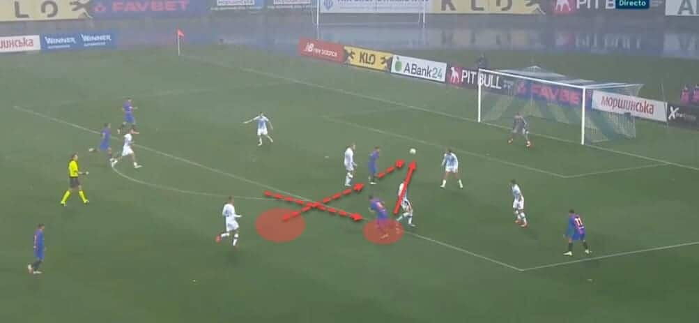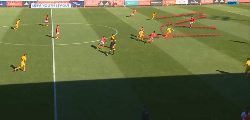 Here, the 17-year-old indeed drops to combine with the midfield and is used as a wall his teammates play off of to switch the direction of the attack. Since the channels towards the flank were properly marked, the only way to advance was to go for a vertical pass towards a descending striker.