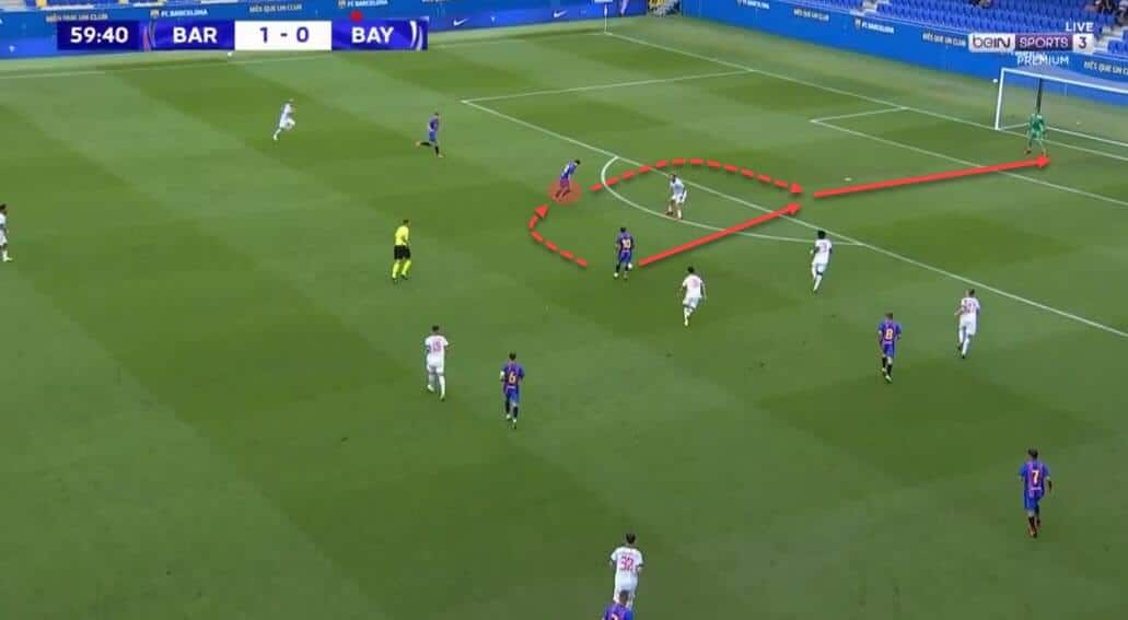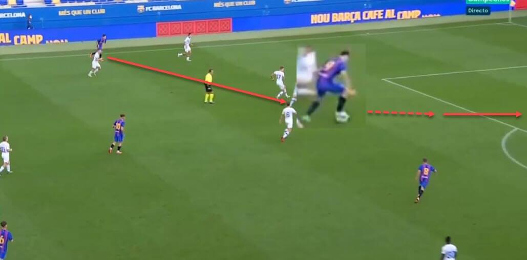 Barcelona are advancing up the left flank and Barbera, who’s initially just behind the defender, curves his run to exploit his marker’s blindside and runs straight into the box to meet the cross seconds later. This, unfortunately, doesn’t result in a goal but still shows how through his great movement, he dismarked himself and got into a great position to score. The subtle movement to position himself behind the defender was key to escaping the marking and ultimately getting to the ball first.