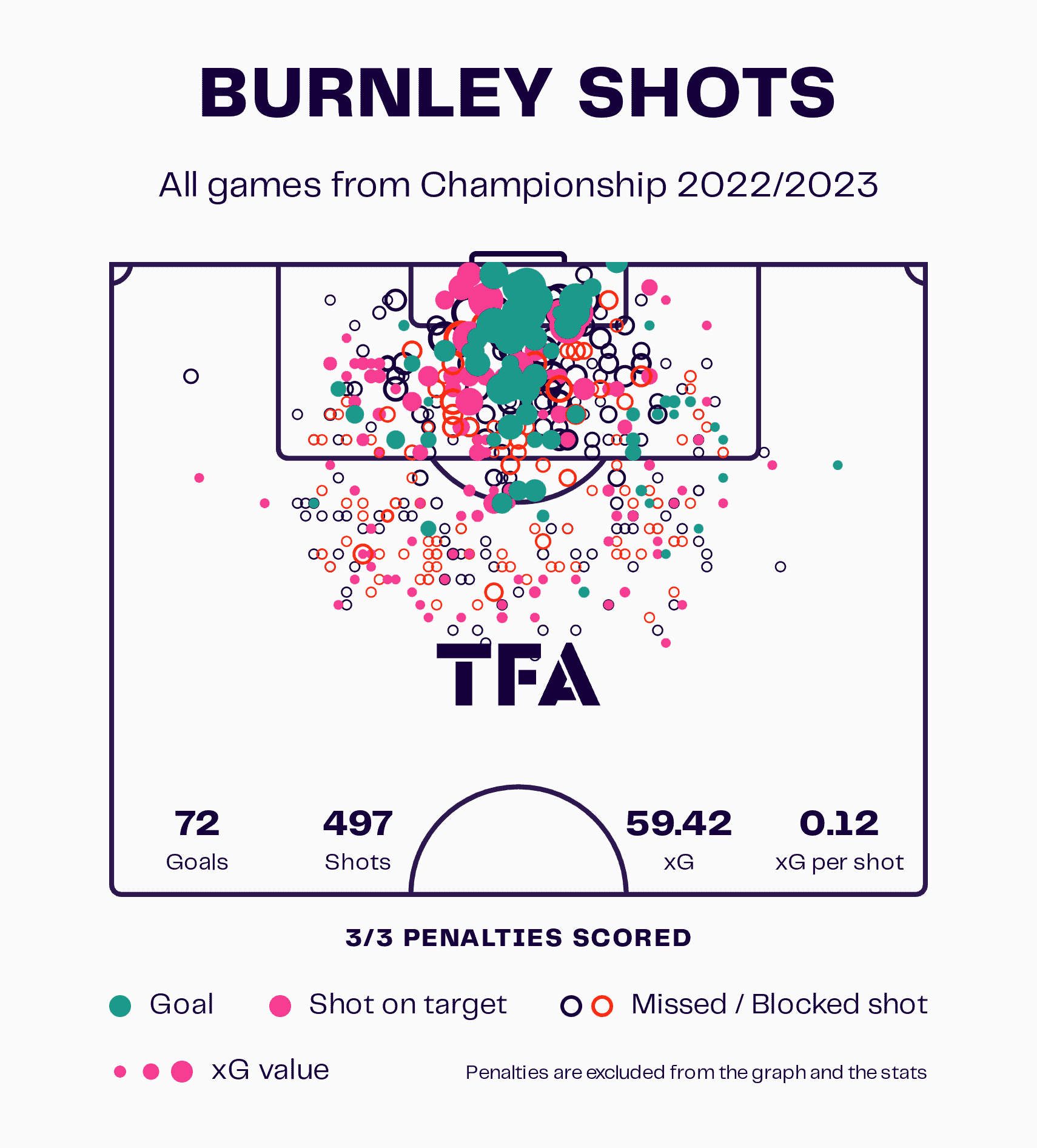 In the Championship 2022/23, Burnley overperformed their xG of 59.42 with an incredible 72 goals, and their shot map below can help us further understand this performance.