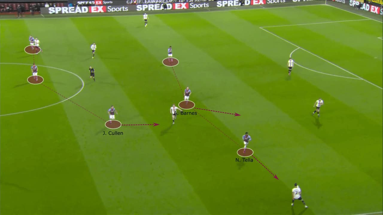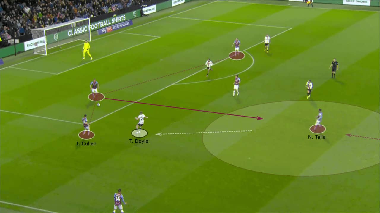In the instance below, after Sheffield play wide, Tella shifts to apply pressure while Cullen comes to pick up the near midfielder.