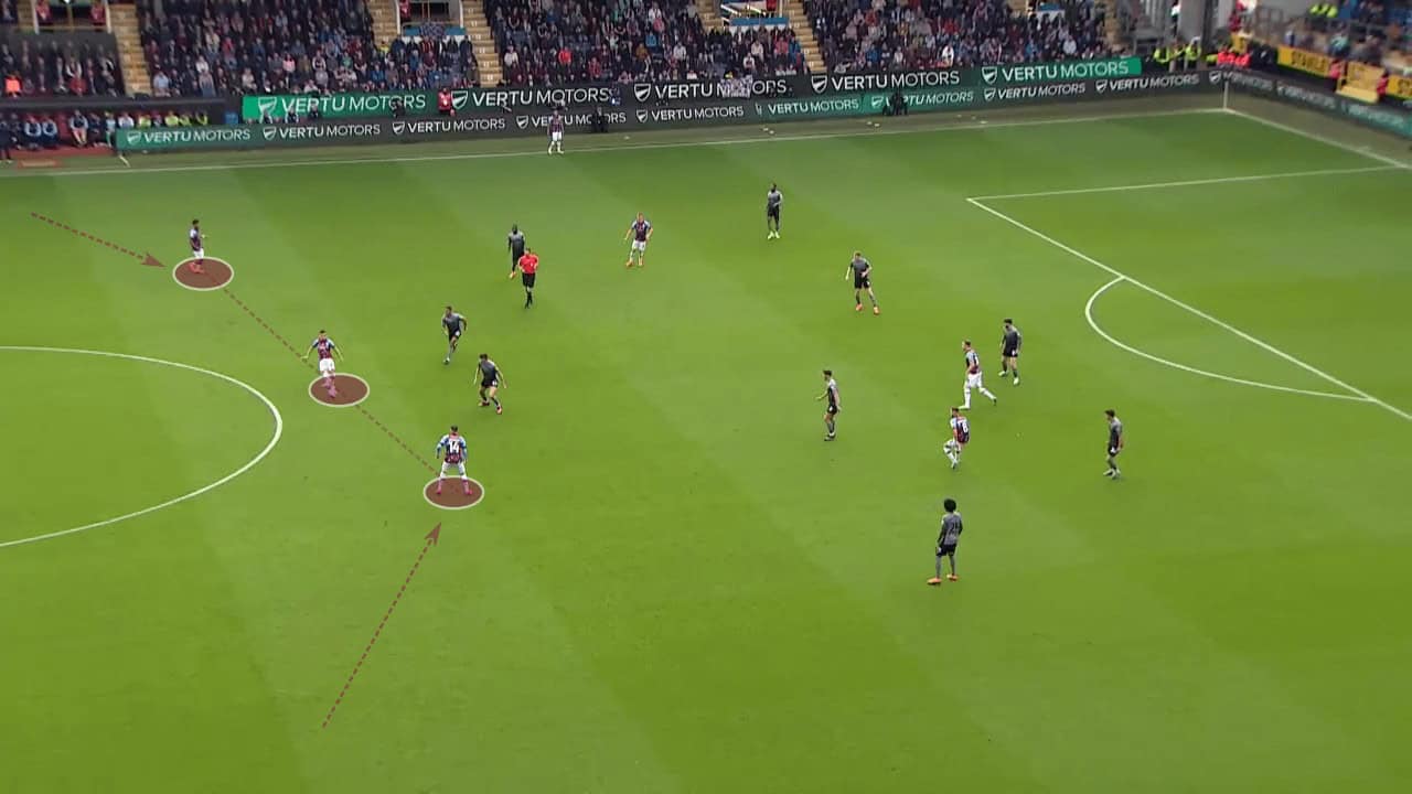 All three immediate options are closed off, and the ball carrier is forced to go long, where Burnley have a 2v1 against the centre-forward.