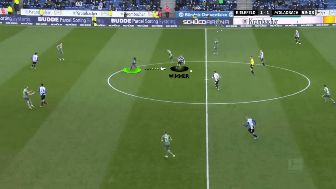 Here, Wimmer is in possession and faces pressure from Borussia Mönchengladbach midfielder Kouadio Koné. As he takes his first touch, he is quite aware of his teammate in front of him making a forward run.