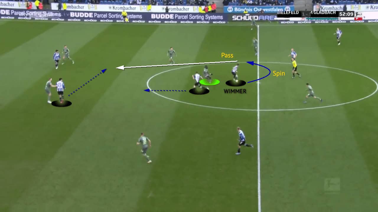 Wimmer uses this movement from his teammates to his advantage. Kouadio Koné notices this movement and takes a slight step back just in case to track. Wimmer spins around into the open space and fires a nicely weighted pass to a teammate further forward.