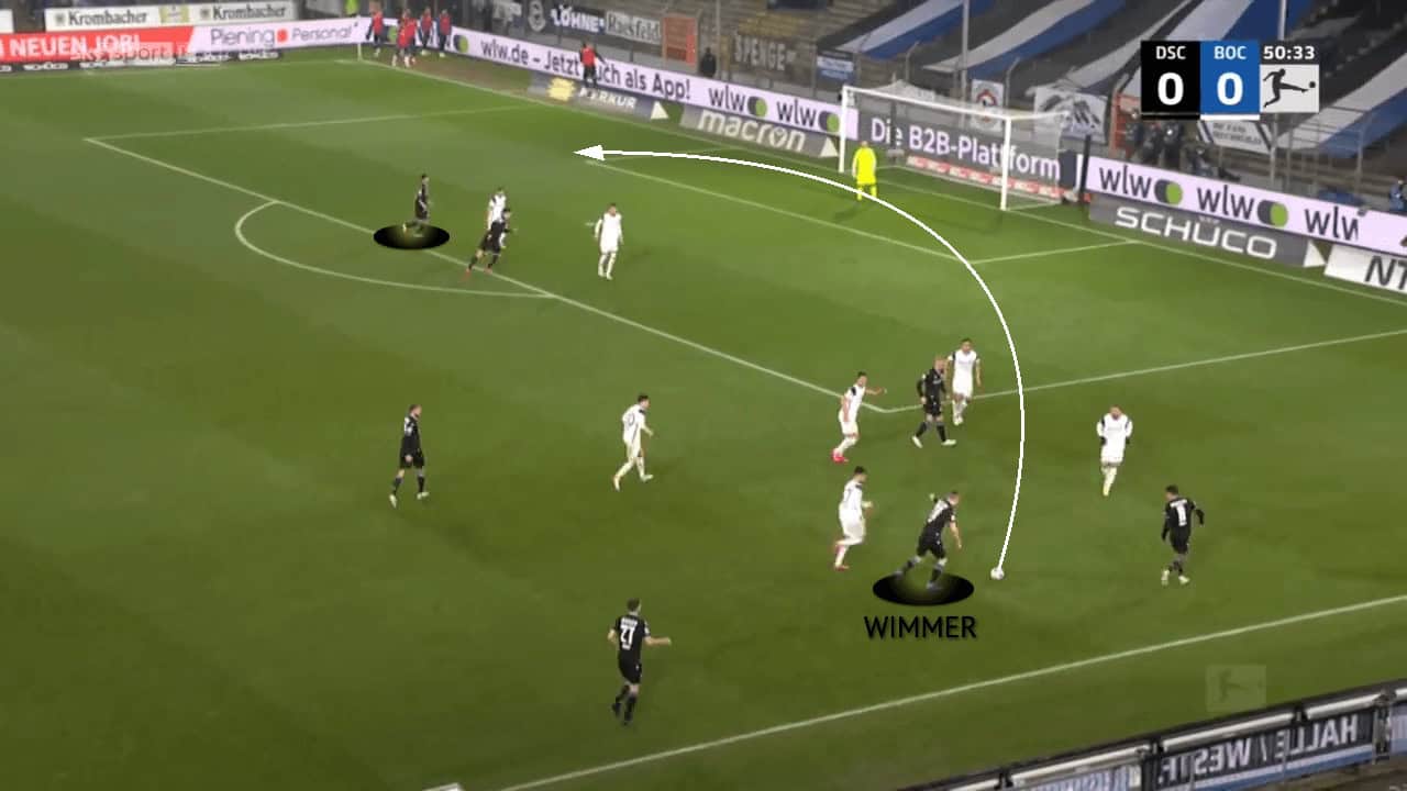 Another example of Patrick Wimmer showcasing his vast technical arsenal can be viewed in the way he receives the ball and in his understanding of space. The Arminia attacker is fluid with his movements and uses this to his advantage as he constantly looks to change the picture and direction of the attack. He can do this by constantly scanning the surrounding space when not in possession of the ball. When the ball is finally played to his feet in the final third, he uses his first touch to great effect, quickly gaining an advantage against the opposition defender. While making use of his first touch, Wimmer does well to allow the ball to roll across his body into space on either side of him before marching forward with the ball.