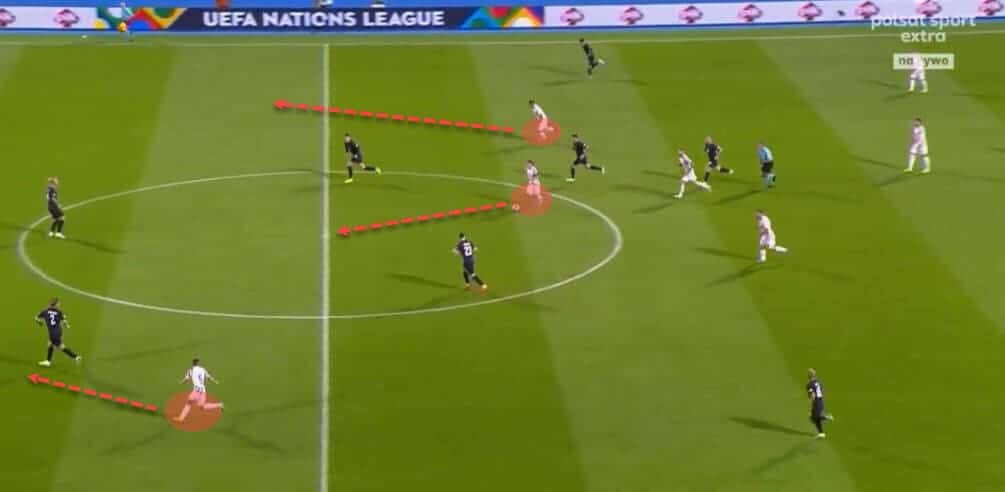 But the fact they win so many offensive duels tells us they are also combative, physical and can overpower teams closer to the penalty area. Their 60.6 percentile ranking in touches in the box per match is both a testament to the squad’s proficiency with the ball and a nose for finding great pockets to exploit within the danger zones. They may not always score goals galore but are more than capable of hurting practically anyone they face. Case in point being their 1-0 victory over France in the Nations League. But what are some of their distinct traits in possession when it comes to tactics?