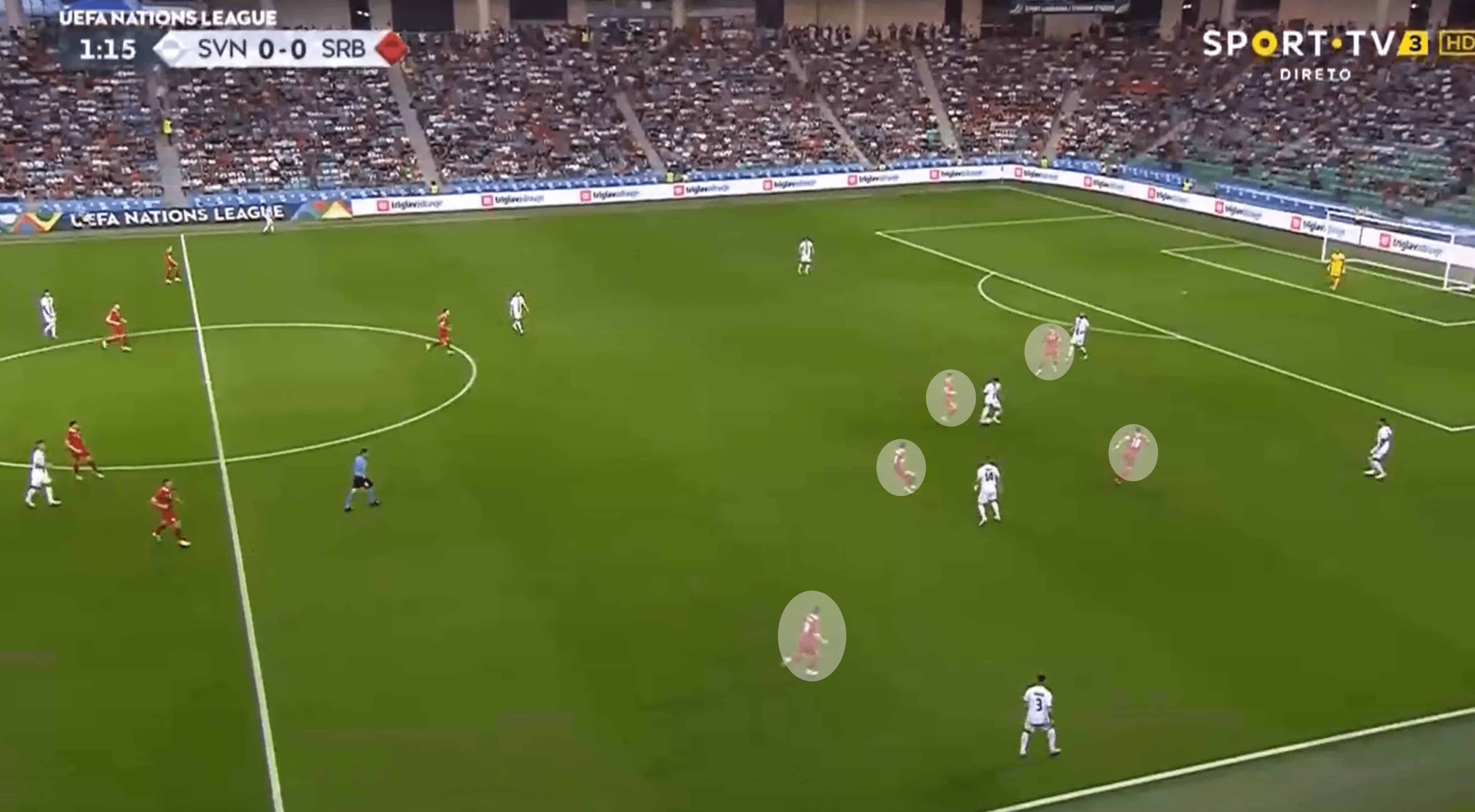 For example, the analysis above occurs in the opposition half, so Serbia look to swarm the Slovenian man and limit his options.