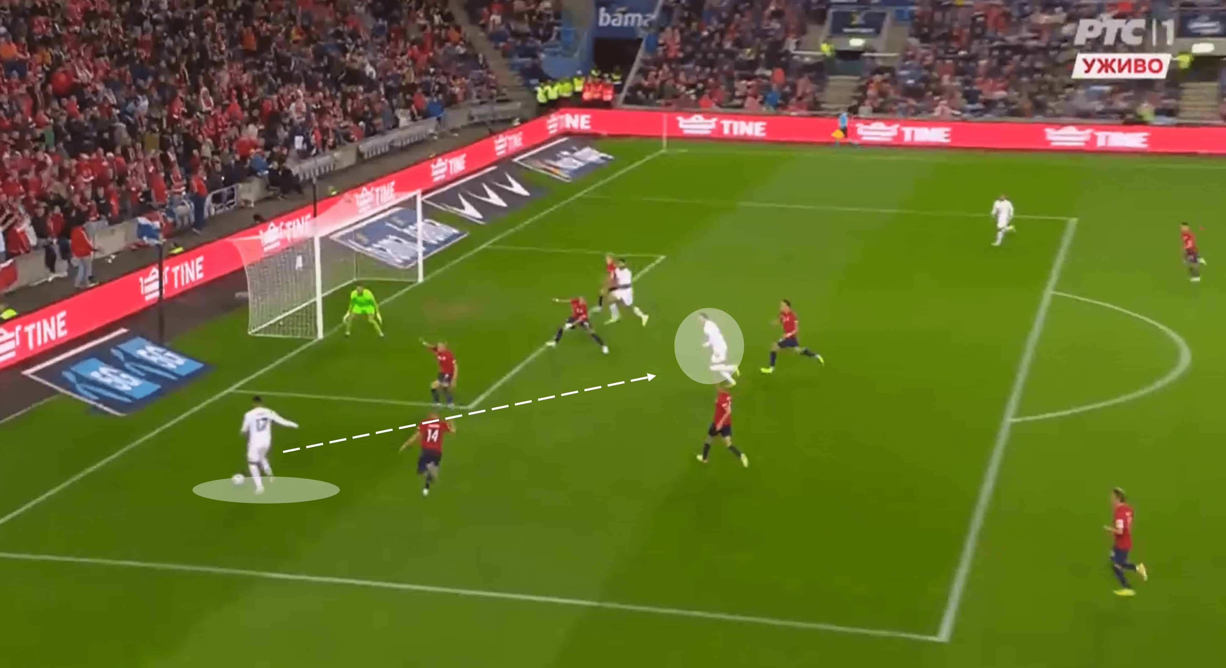From there, the presence in the box tries to find space and generally be a nuisance for the opposition as they await the cross — physicality and aerial superiority are two strong traits of this Serbian team in attack.