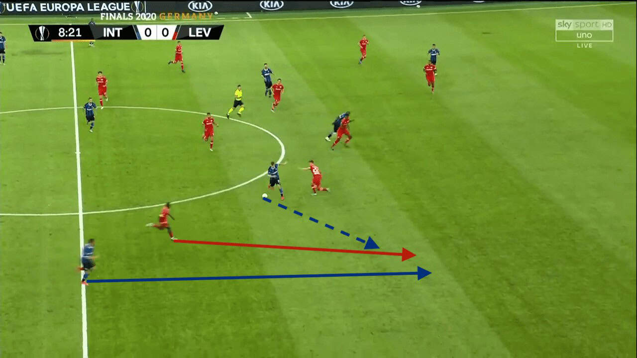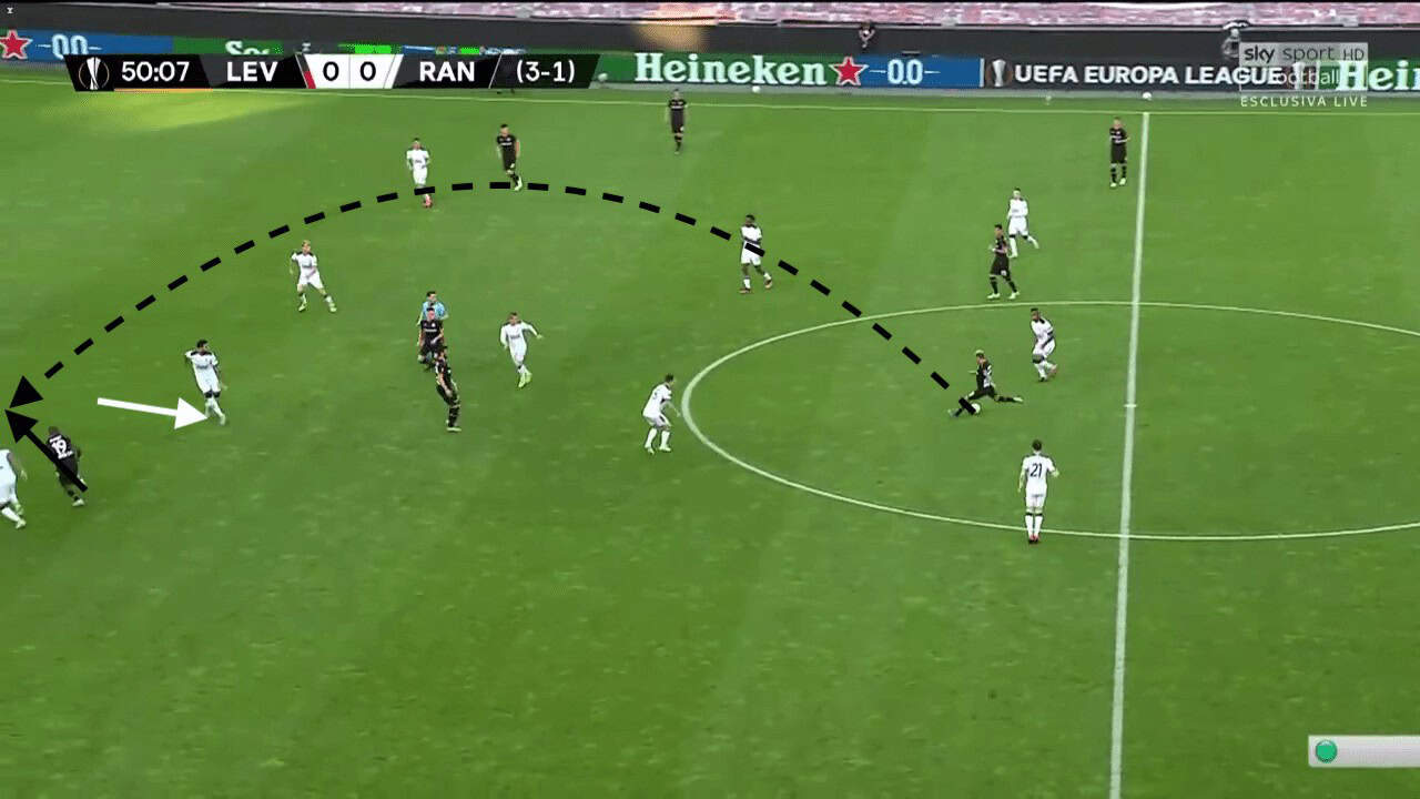 Here, against Rangers in the Europa League, he makes a fantastic run in behind. The opposition centre-back pushes up in order to make it difficult for Leverkusen to build-up but since the whole backline didn’t move up with him, there was space vacated by the defender. Diaby, knowing this and knowing that Rangers can’t play the offside trap because of the defender’s movement, makes a darting run in behind and is found, which opens the scoring for the team. While in this scenario Diaby gets the goal, he makes similar runs but closer to the wing so that he gets in a position to cross to set up his teammates.