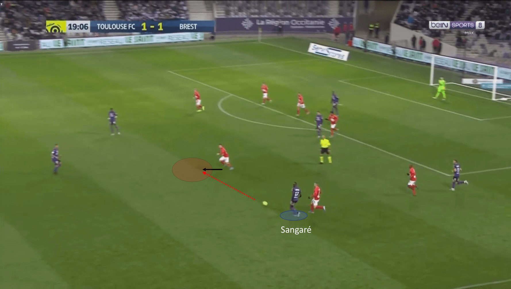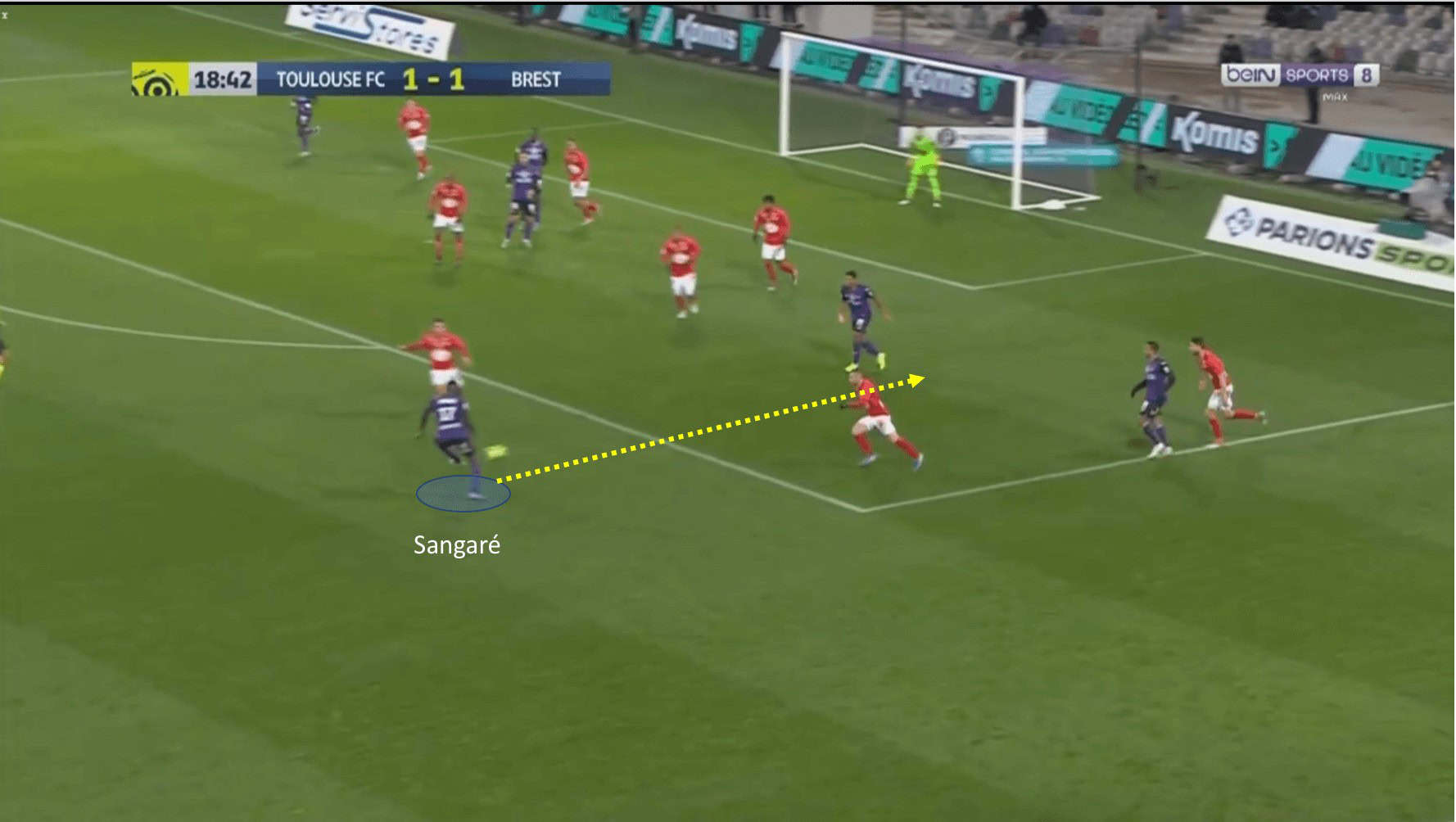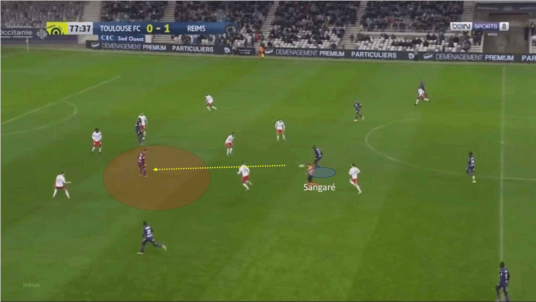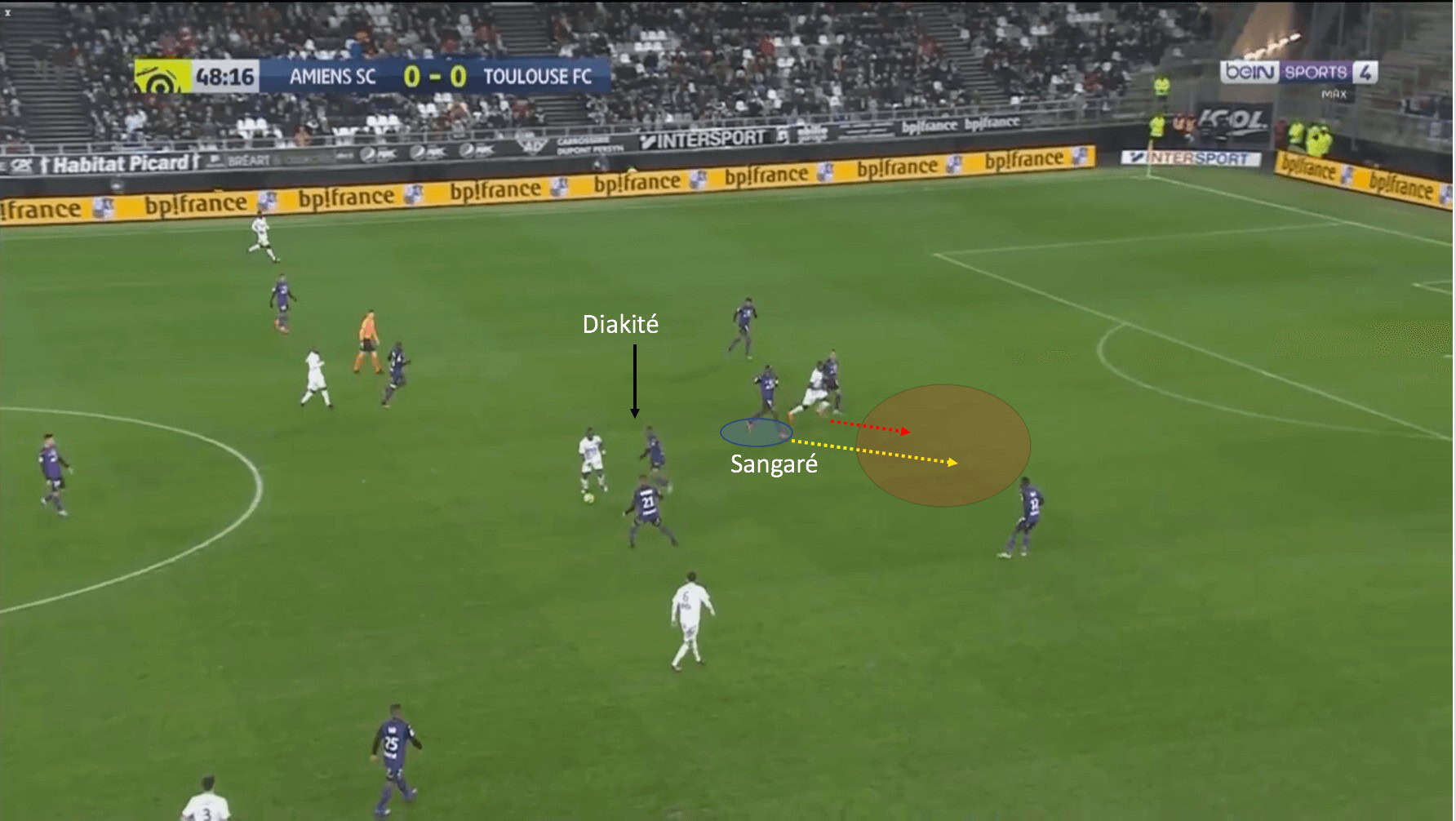 As shown in the figure, Sangaré was attempting a pass into the right wide channel for Toulouse’s right-back who was pushing high into the final third.