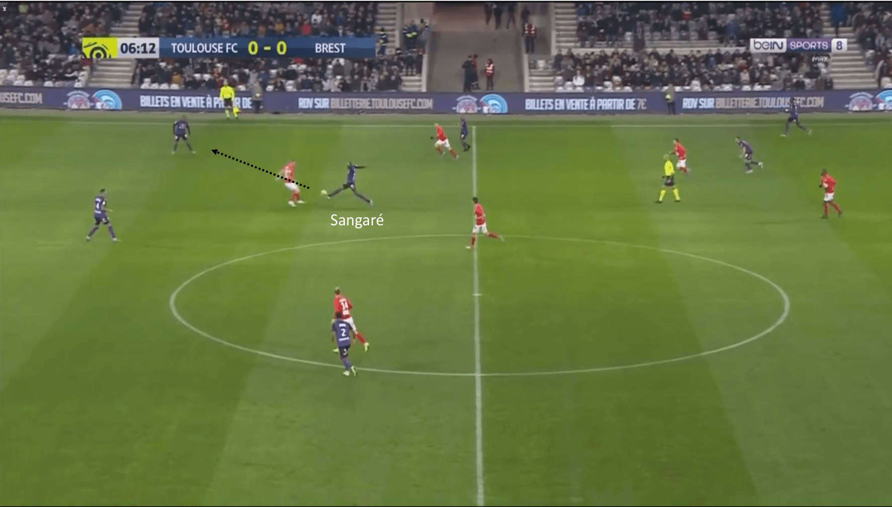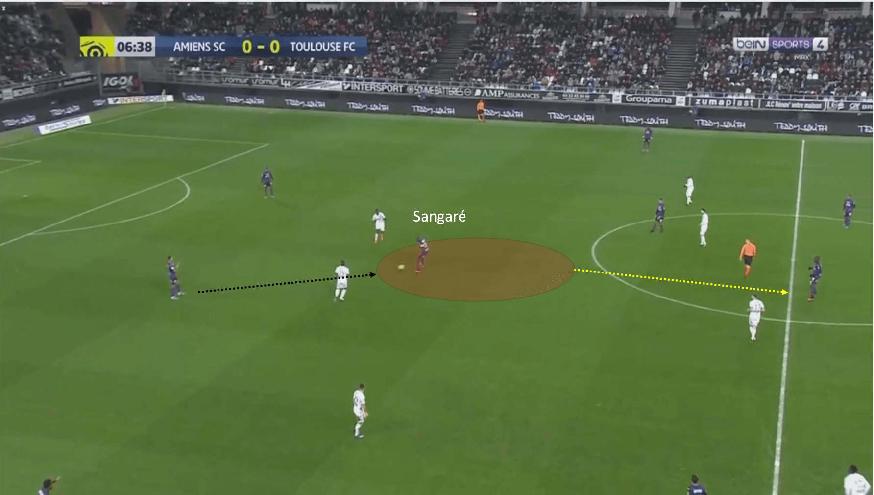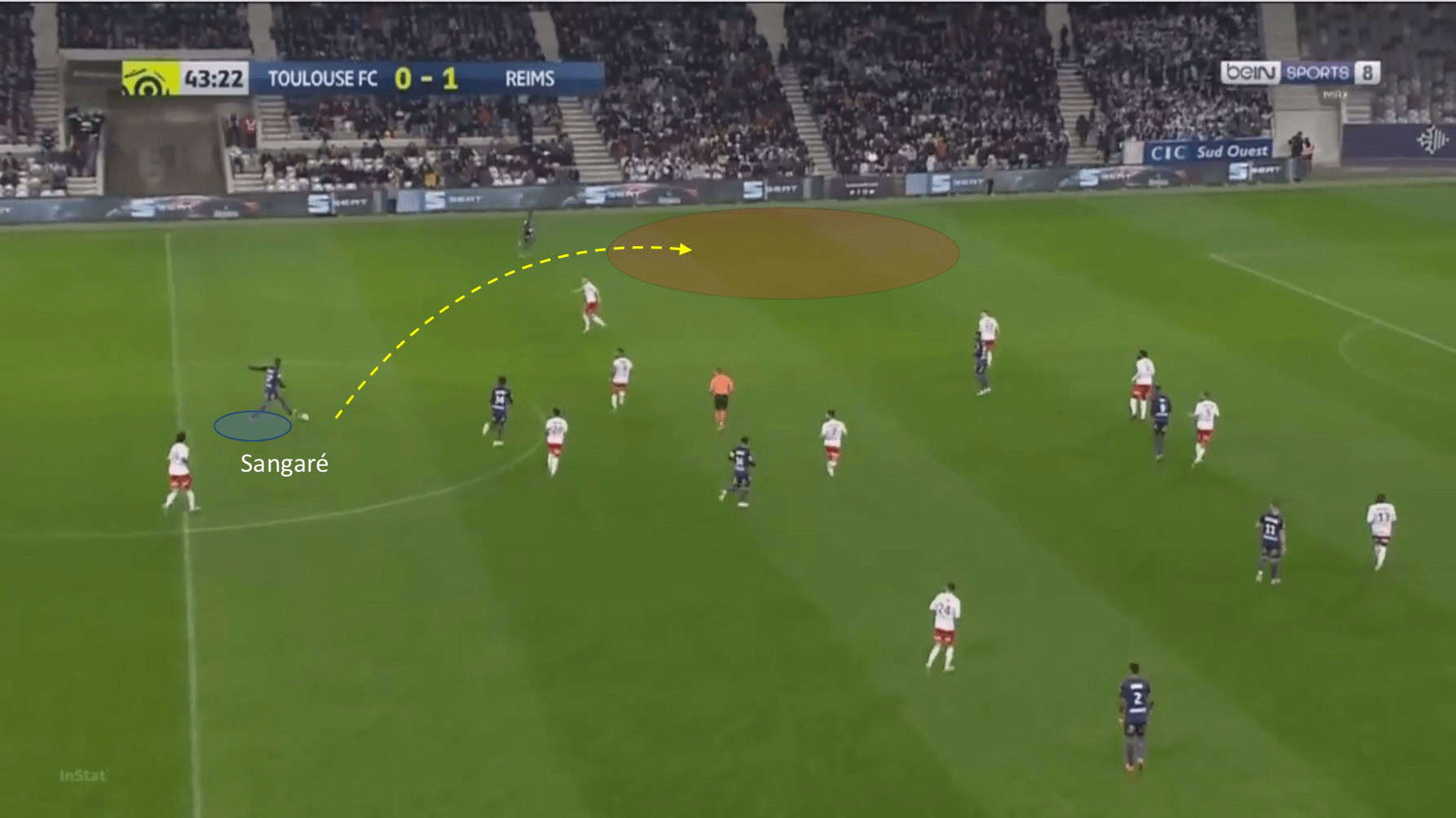 As shown in the figure, Sangaré was attempting a pass into the right wide channel for Toulouse’s right-back who was pushing high into the final third.