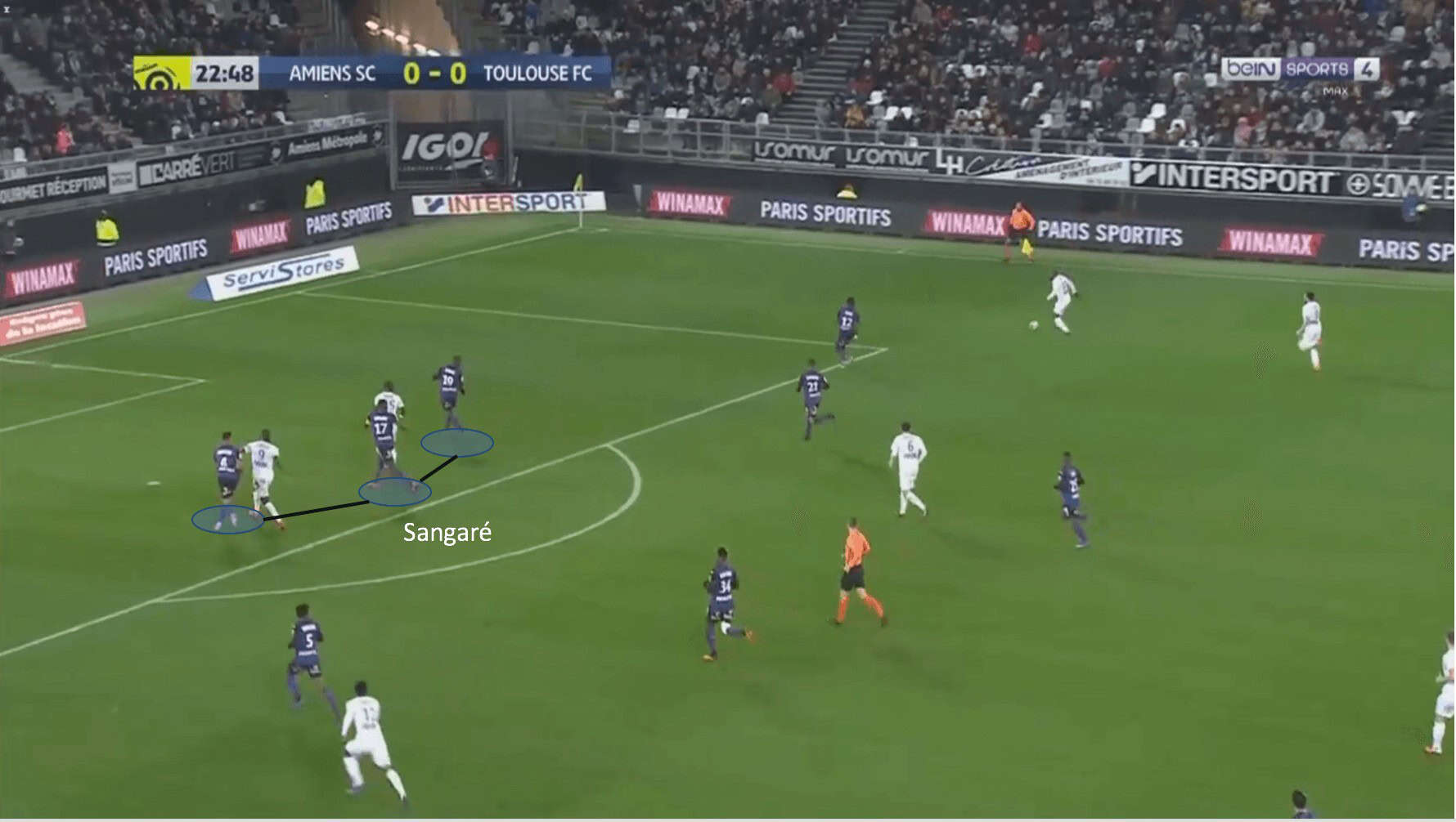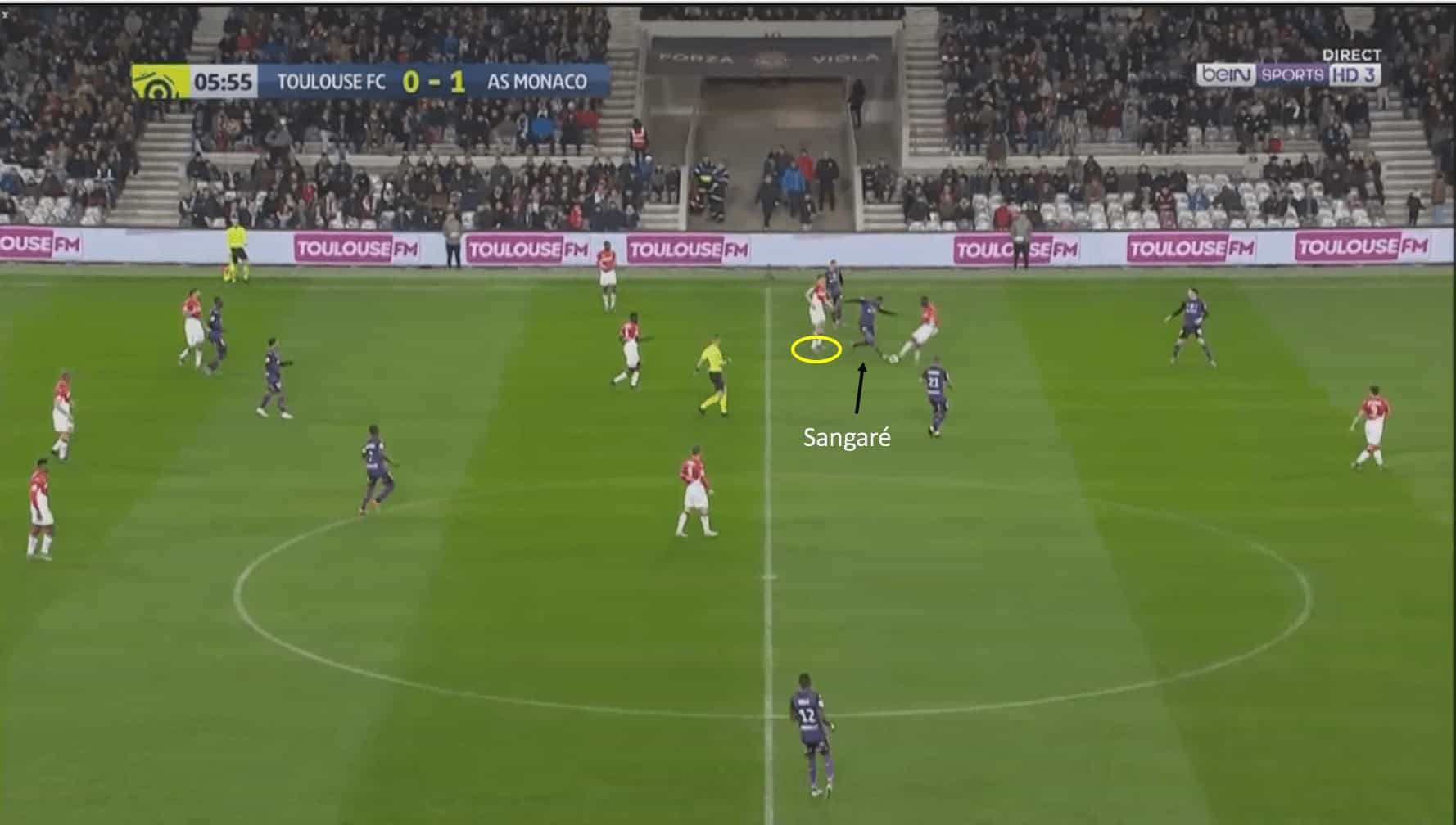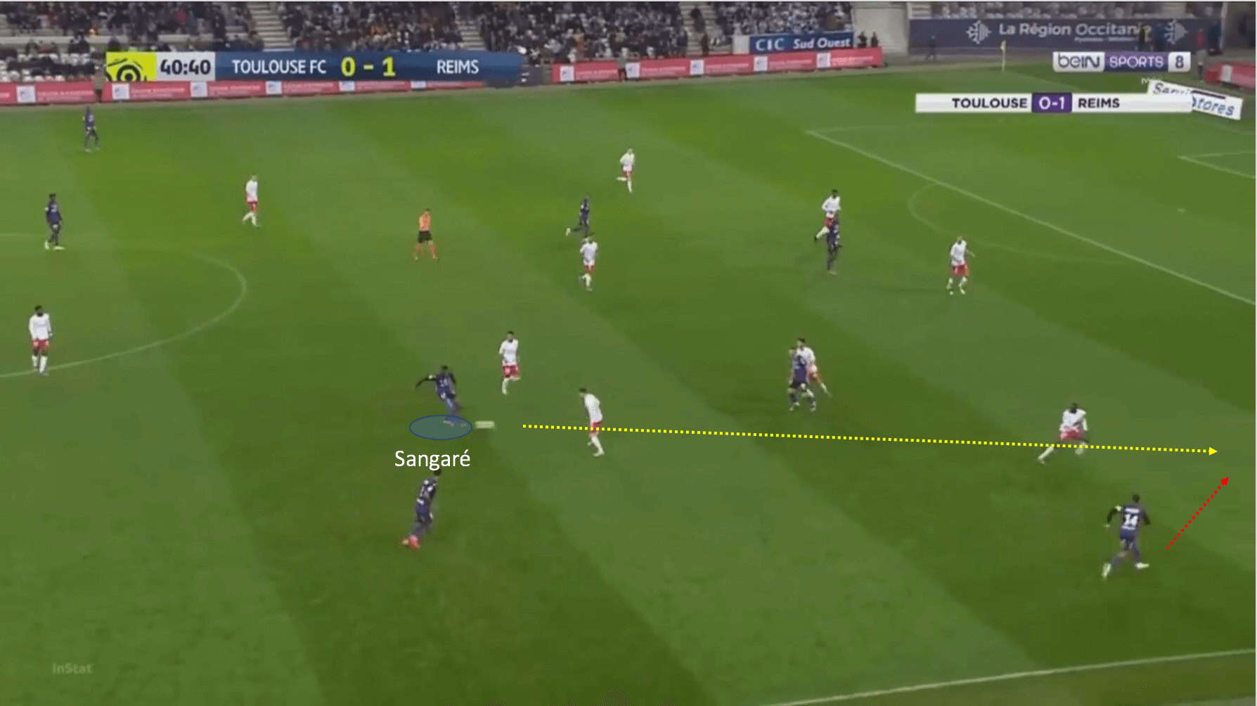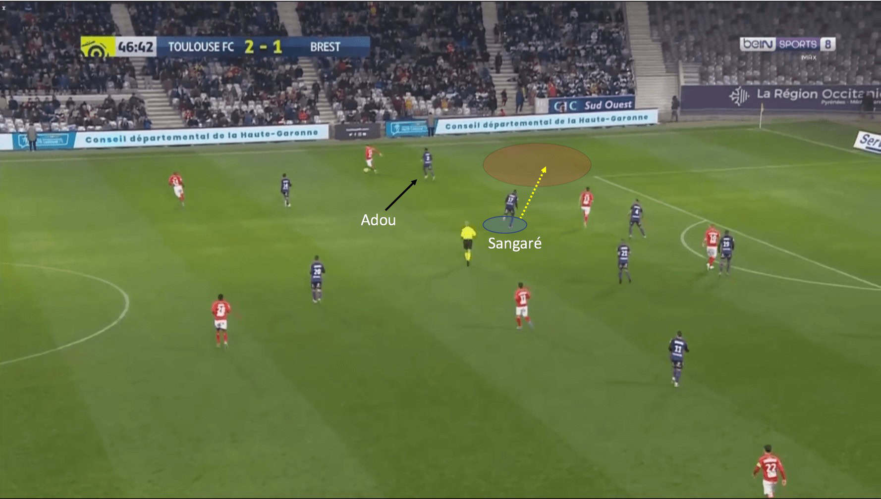 As shown in the figure, Sangaré was attempting a pass into the right wide channel for Toulouse’s right-back who was pushing high into the final third.
