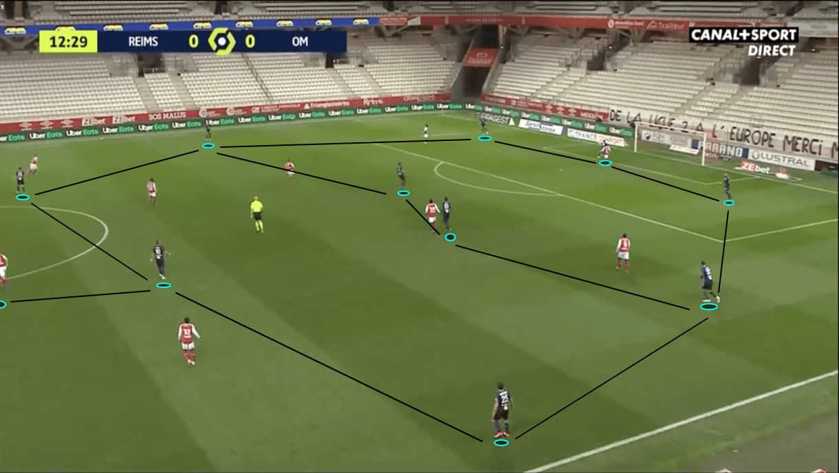 In figure 1, we see an example of how Sampaoli’s Marseille have typically shaped up from a goal-kick. At this very early stage of the build-up, two of the centre-backs the central one and often the right-sided one, stay inside the box and sit either side of the goalkeeper. Meanwhile, the other centre-back, often the left-sided centre-back as was the case here in figure 1, pushes into more of a full-back position.