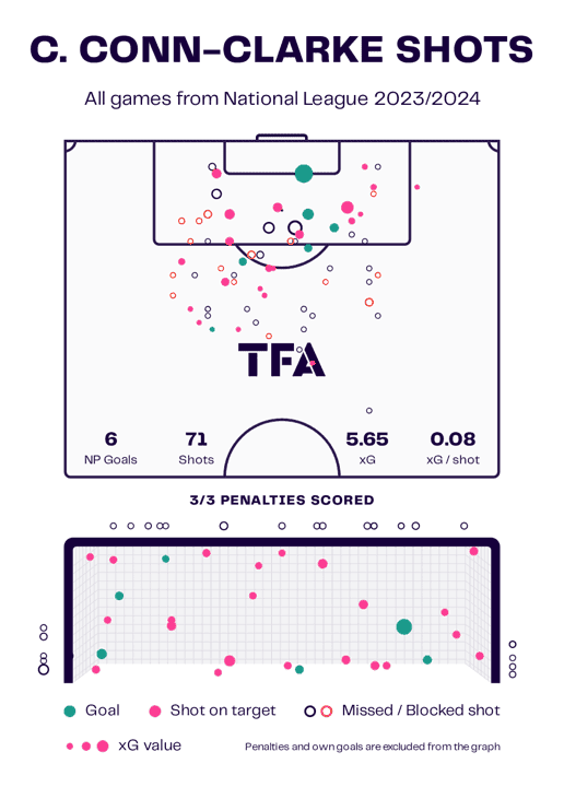 Some may argue Conn-Clarke’s good season so far should be praised as much due to three of his nine goals coming from the spot, but there are various factors that would dispute that, and they all relate to his solid & positive involvement in attack in other areas, as we already spoke about. There is also a lot to be said about a player being reliable from the spot, as he is.