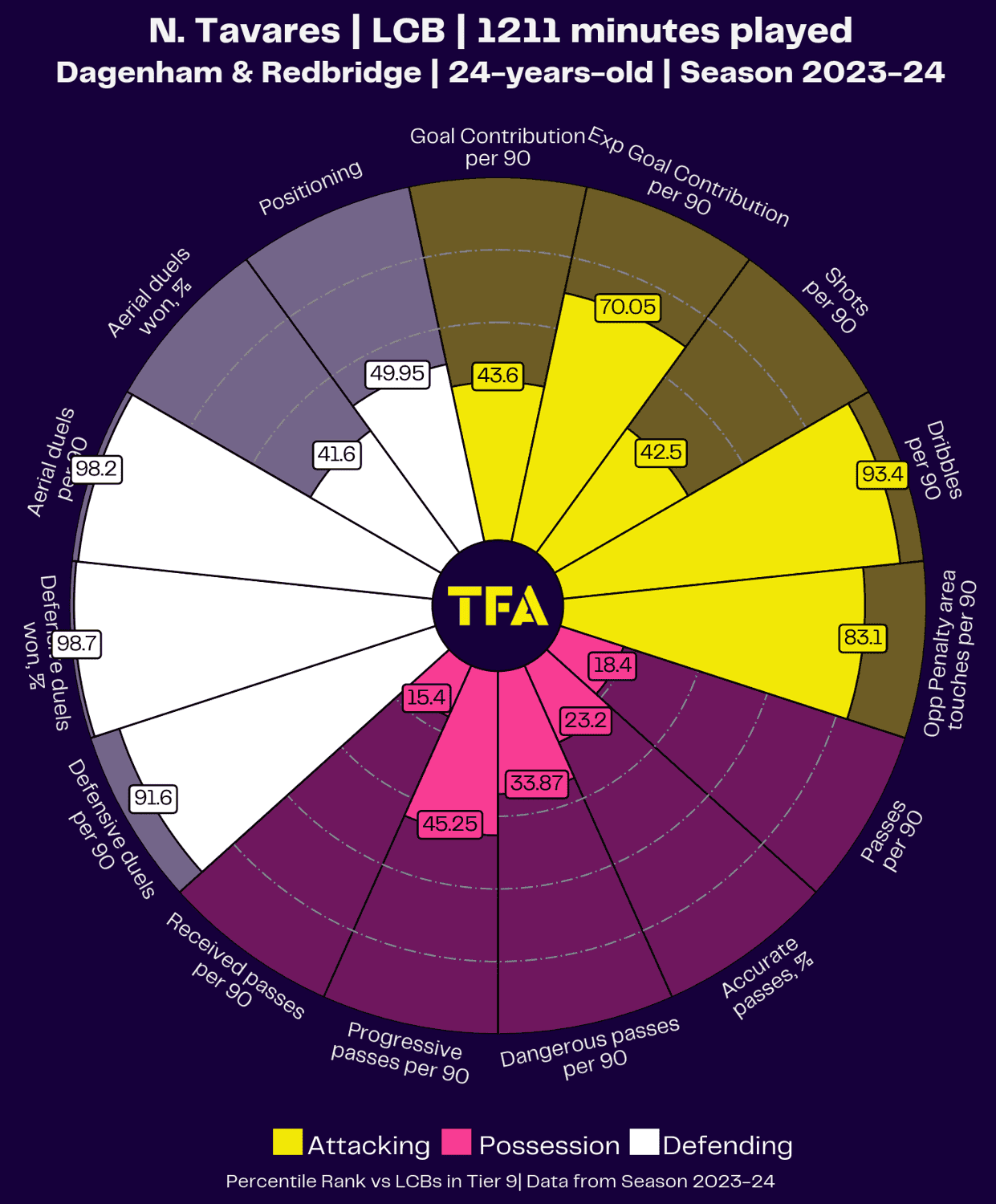 Tavares has the element of versatility to his game, able to play at left-back and even in a variety of midfield roles, but most of his football this season has been played at LCB. When comparing his data to that of other LCBs in the various tier 8 leagues around the world, his defensive ability shines, excelling in key areas like defensive duels (both engagement and success) while also getting involved in a high number of aerial duels.