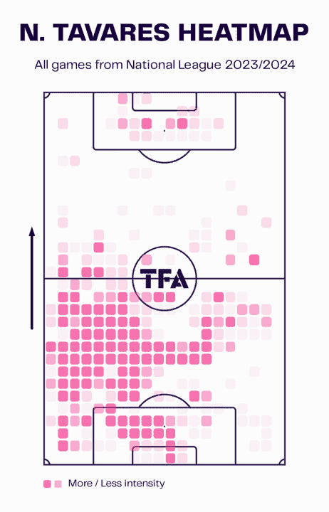 Tavares does not shun defensive duties either – he currently averages 7.85 defensive duels per 90, winning an impressive 83.76% of them – the second-highest win rate in the National League and the highest of anyone 25 and under. When making a challenge, he shows good timing and anticipation as well as the technique required to make the tackle itself. Furthermore, he makes 4.9 interceptions per 90, playing an essential role in that area as his side ranks second in the league for interceptions per 90.
