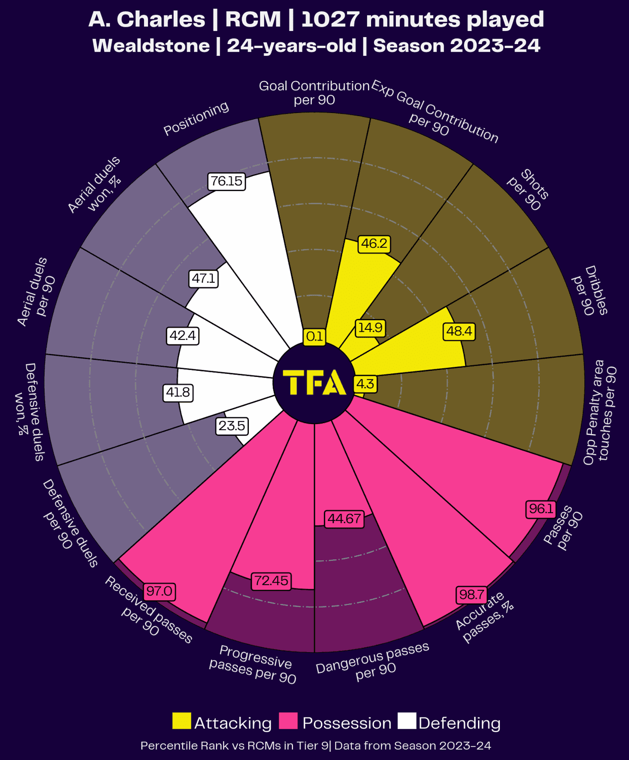 The midfielder also has one of the highest long passing accuracy rates of an outfield player in the National League this season, hitting 60.71% of his 4.15 long passes per 90. He also ranks seventh in the league rankings for passes to the final third, hitting 79.01% of his six efforts per 90 – a low engagement in comparison to the league standings. Charles comes with a 92.01% overall pass accuracy, making him one of the most reliable passers in the National League. Some teams simply want a reliable, consistent passer in midfield to keep things tidy and problem-free, and Charles brings that element.
