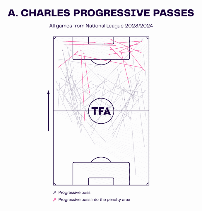 As you may imagine from this data visual above, 24-year-old Charles operates in a deeper midfielder role, focusing on moving the ball forward mainly via passing, at which he stands out. In what may be a surprise, though he doesn’t have a high defensive engagement in that role, ranking in a low percentile for defensive duels – he makes 5.86 per 90, winning 57%, it looks as though Wealdstone want Charles to lean into his strengths (passing). The map of his progressive passes below gives us a chance to discuss his passing ability further.