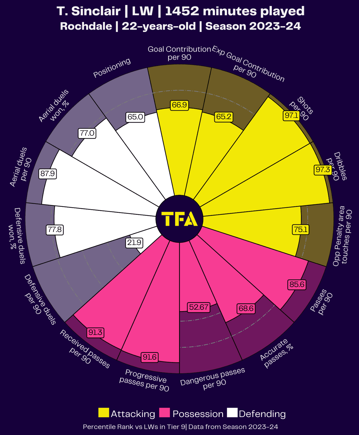 This season, he’s hit the ground running, scoring eight in 16 so far – he will want to start adding some assists, but he knows how to get into scoring positions in the final third. Able to play comfortably on either wing or through the middle, Sinclair has the essential element of being versatile in attack, reflected in his data compared to tier 9 players in the visual above. He ranks in high percentiles for various passing engagement metrics and ranks high for shots per 90 (3.22 per 90, 30.8% on target) and touches in the box per 90 (3.22). He also likes to run with the ball, but we will dive deeper into his dribbling stats later on.