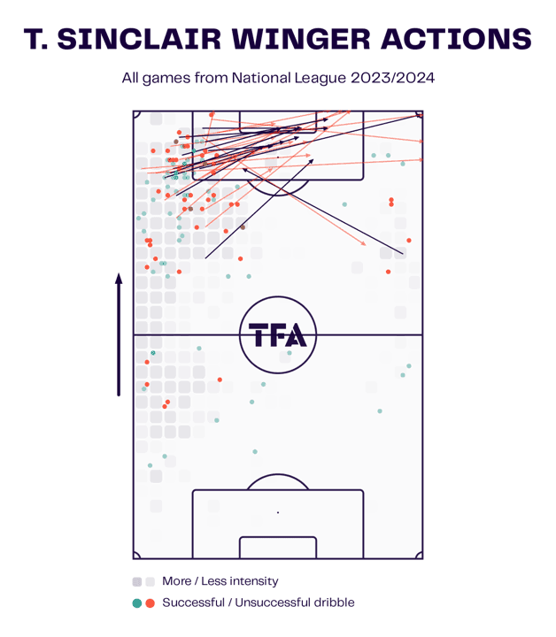 His dribbling ability is a real attacking threat for Rochdale, as evidenced by his high percentile rank above and his average of 8.62 per 90 (fourth-highest in the league), of which 59% are successful, which ranks in the top 30 within the National League. He is most dangerous in the zone around the corner of the penalty area as he looks to either break into the box or work the ball down to the byline prior to a delivery.