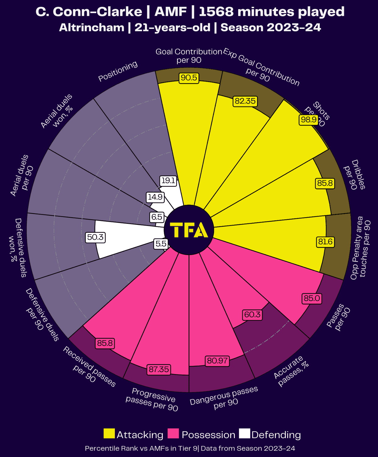 As the data visual above tells us, Conn-Clarke is not afraid to get involved in attack, whether it be various passing, dribbling, or activity in the box, and has high success rates across the board – ranking in high percentiles for pretty much anything that isn’t a defensive metric.