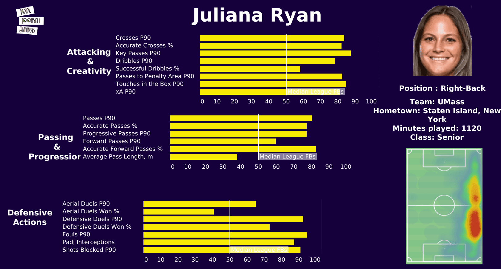 Looking at her passing and progression percentile ranks, she’s very heavily involved in UMass’s attack.