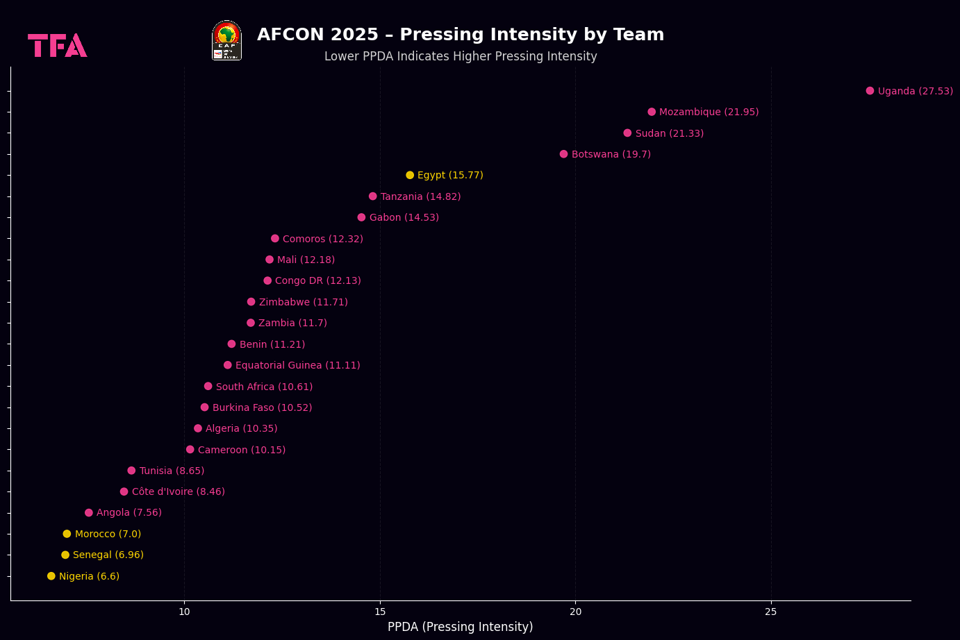 AFCON 2025 Pressing Intensity (PPDA) (Lower PPDA Is Higher Pressing Intensity)