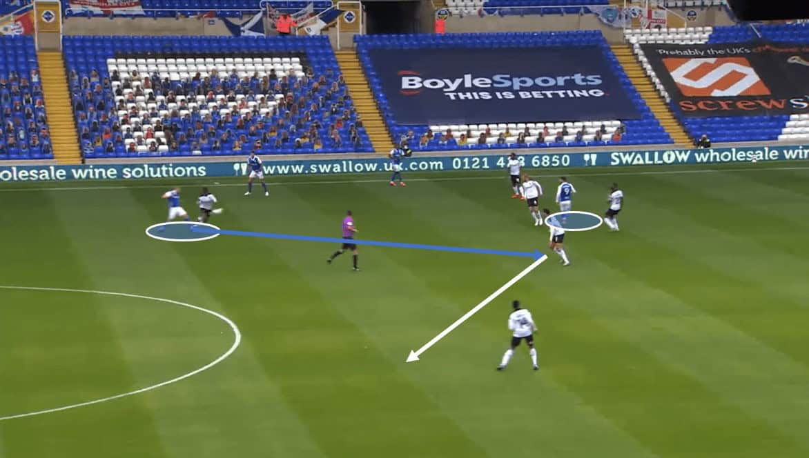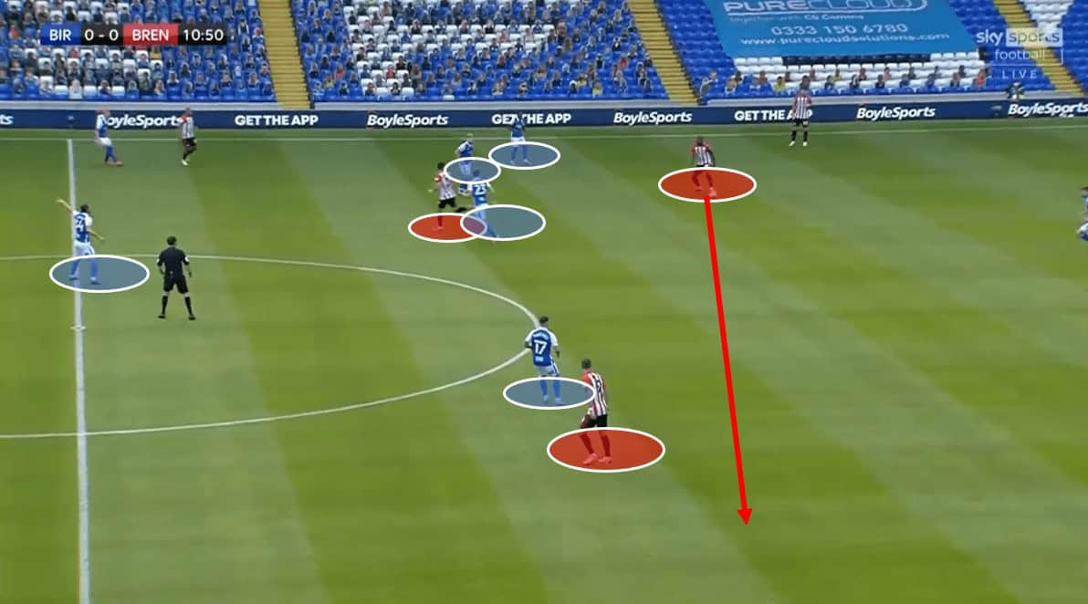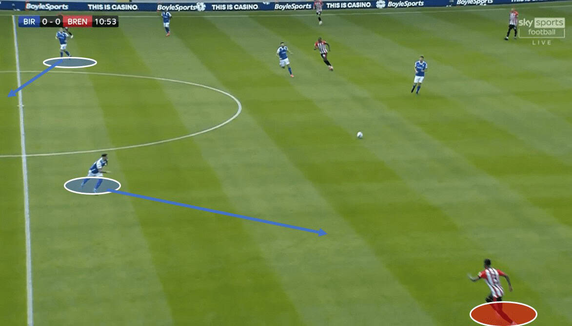 Ultimately, as the move progressed Clayton stopped pressing Dasilva and Bela took up an extremely wide position to shut off the ball to the right side. As already mentioned, Clayton tracked Dasilva in the first place, but as soon as the options became scarce, he chose to drop off back into his original position. Brentford ended up recycling the ball to the other end of the pitch in search of options as the move developed, which was something that happened regularly during this game. Birmingham’s defensive setup is all about man-marking, removing any options possible through a shape that is extremely hard to play against.