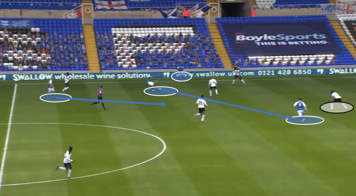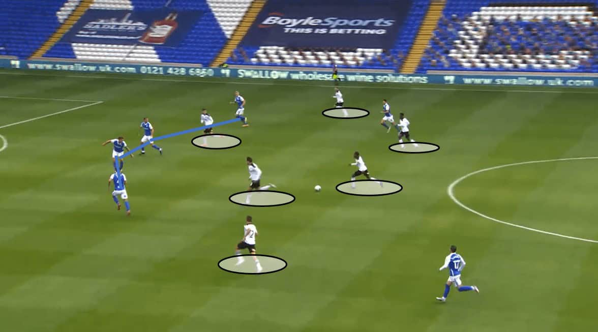 We can see in the final frame of this move above that as the ball is switched to the left-back by Dasilva, Clayton rushes back to his position in the double pivot. This is a perfect example of how Karanka’s sides control the game out of possession as they frustrate their opponent who enjoy long periods of the ball. In fact, it is in these sorts of games that Birmingham will thrive under Karanka this season. When they are dominated through possession and can attack on the counter and through set-pieces, they will be a real threat and will cause many superior teams problems.