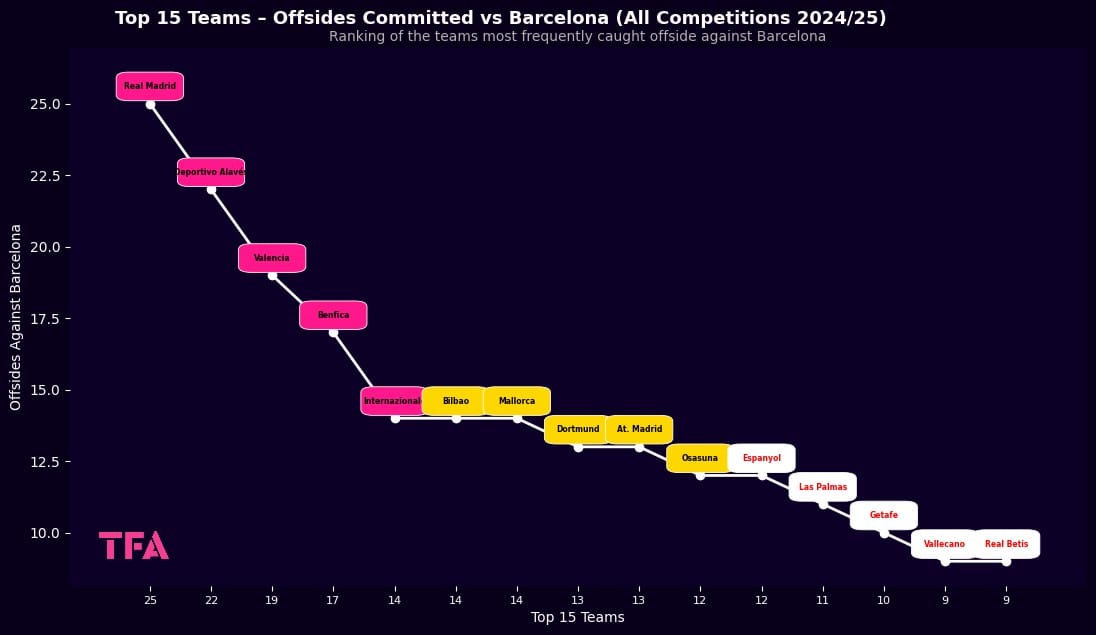 Across all competitions in 2024/2025, Barcelona caught their opponents offside on 115 occasions, with 75 in La Liga, 25 in the Copa del Rey, and 15 in the Spanish Super Cup.