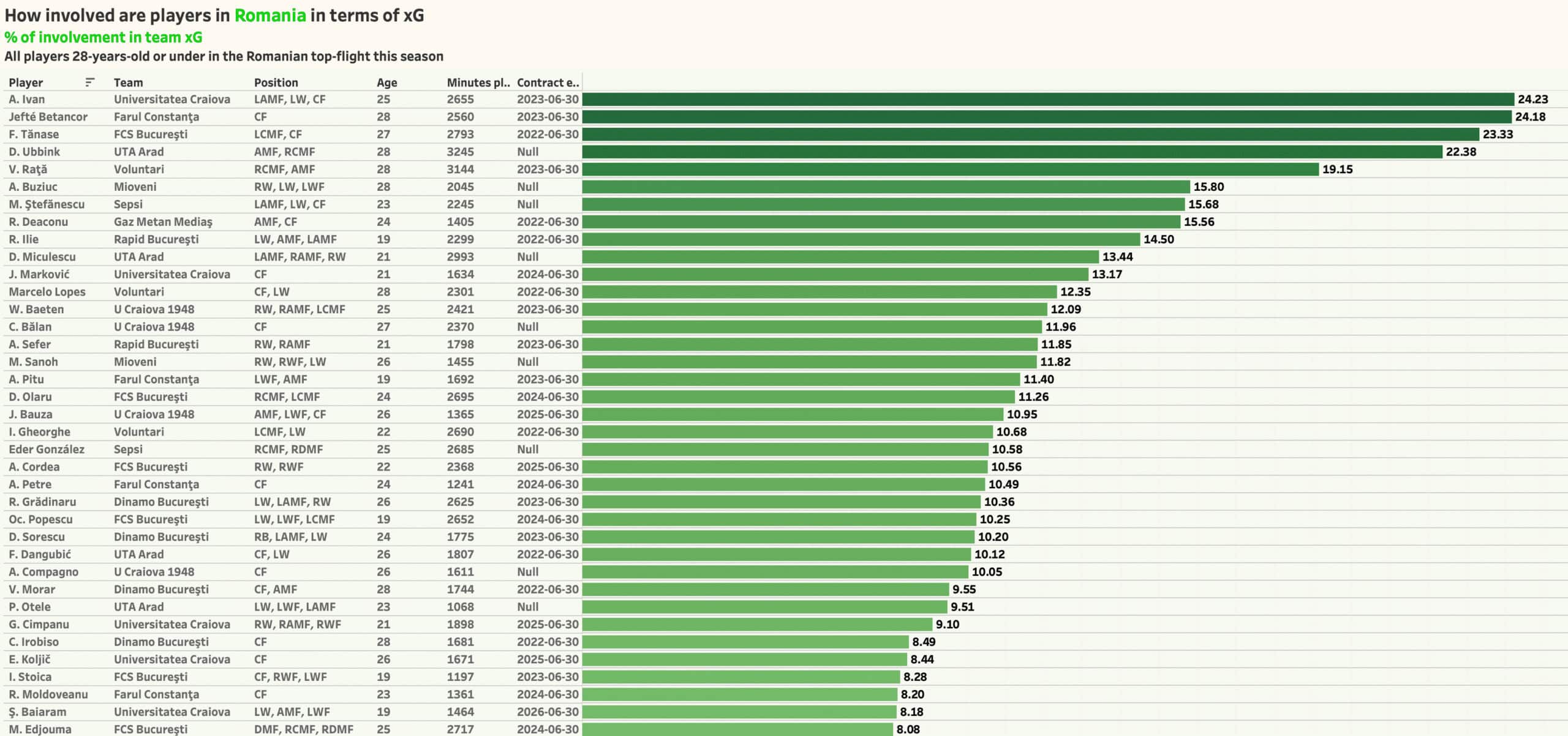 Once again Andrei Ivan is at the top of our ranking with 24.23% next is the Farul Constanta striker Jefte Betancor on 24,18% and then we have Florin Tanase of FCSB once more on 23,33%. Crucially when using rankings like this you can add extra information. I always have position, age, minutes played and contract expiry information added in. This allows you to add some context to the players who are further down the rankings.