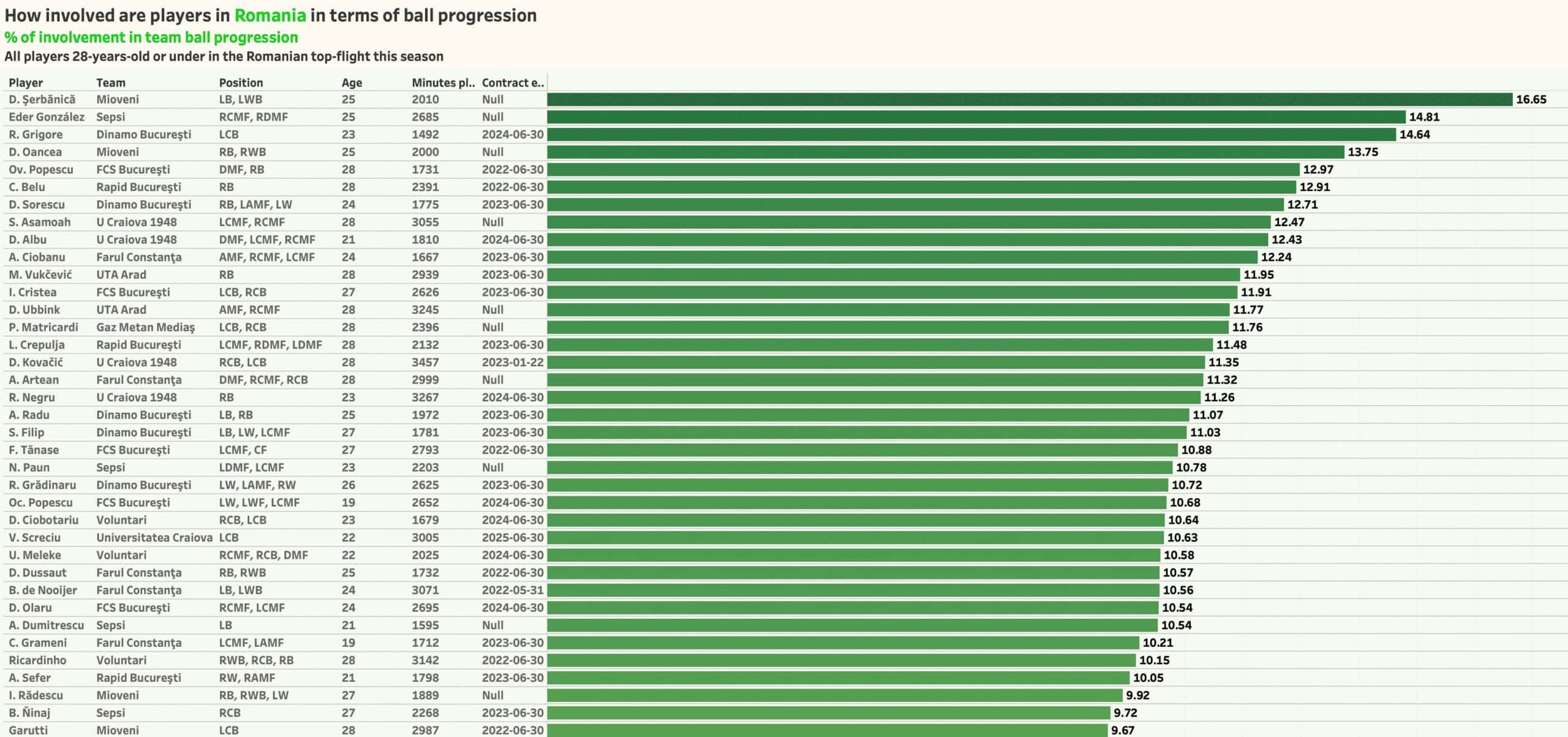Top of our ranking this time is the 25-year-old CS Mioveni left-back Daniel Serbanica who is responsible for 16.65% of his team’s total progressive actions. Next is the central midfielder Eder Gonzalez of Sepsi on 14.81% and finally we have Ricardo Grigore, a 23-year-old central defender, for Dinamo Bucharest at 14.64%.
