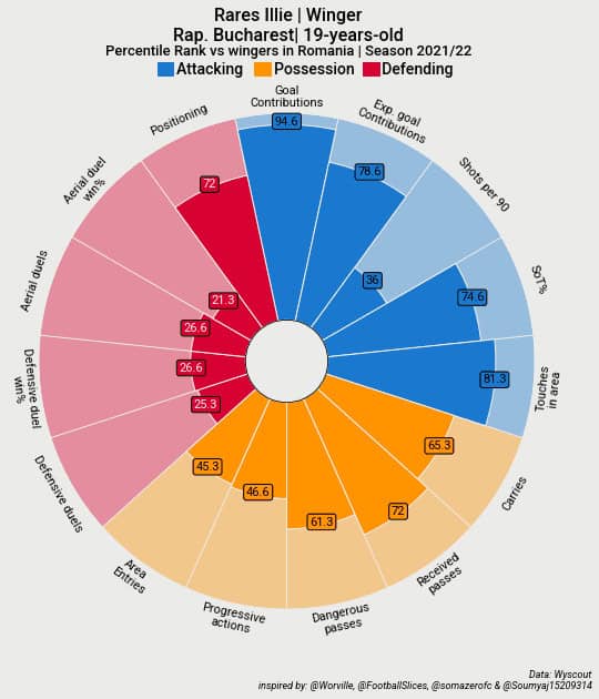 In these pizza charts, I have a number of metrics, like dangerous passes and carries, that are not immediately available within wyscout. They are created by combining key metrics in order to provide additional context within the data set. As you can see at first glance Andrei Ivan is having a very, very strong season so far in front of goals. His output for all five attacking metrics that we use for our forward profiles. He is a goalscorer who gets into great positions and takes a high volume of shots. He is less impressive in the passing and progression phase but the fact that he tends to occupy high positions means that his output for area entries (crosses + passes into the area) are also very impressive.
