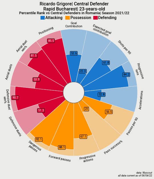 Ricardo Grigore is a young central defender with an interesting profile. His defensive outputs in particular look good and although he is not stand out in terms of the volume of defensive duels and aerial duels this is to be expected given his high output in terms of positioning. It is also worth noting that Grigore has a strong output in terms of the % of successful defensive and aerial duels. In other words, his positioning allows him to not have to engage in a high volume of duels but when he does have to he tends to be successful.