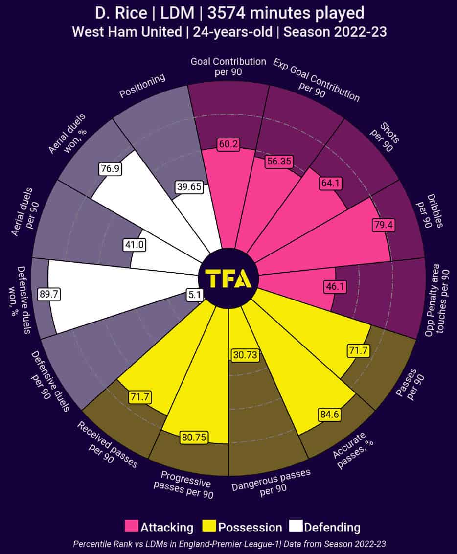 West Ham’s captain Declan Rice has been the subject of a lot of transfer speculation recently. With the club seemingly set to lose their star player during the summer transfer window, a suitable replacement will have to be found. Below is his pizza chart for the 2022/23 Premier League season.