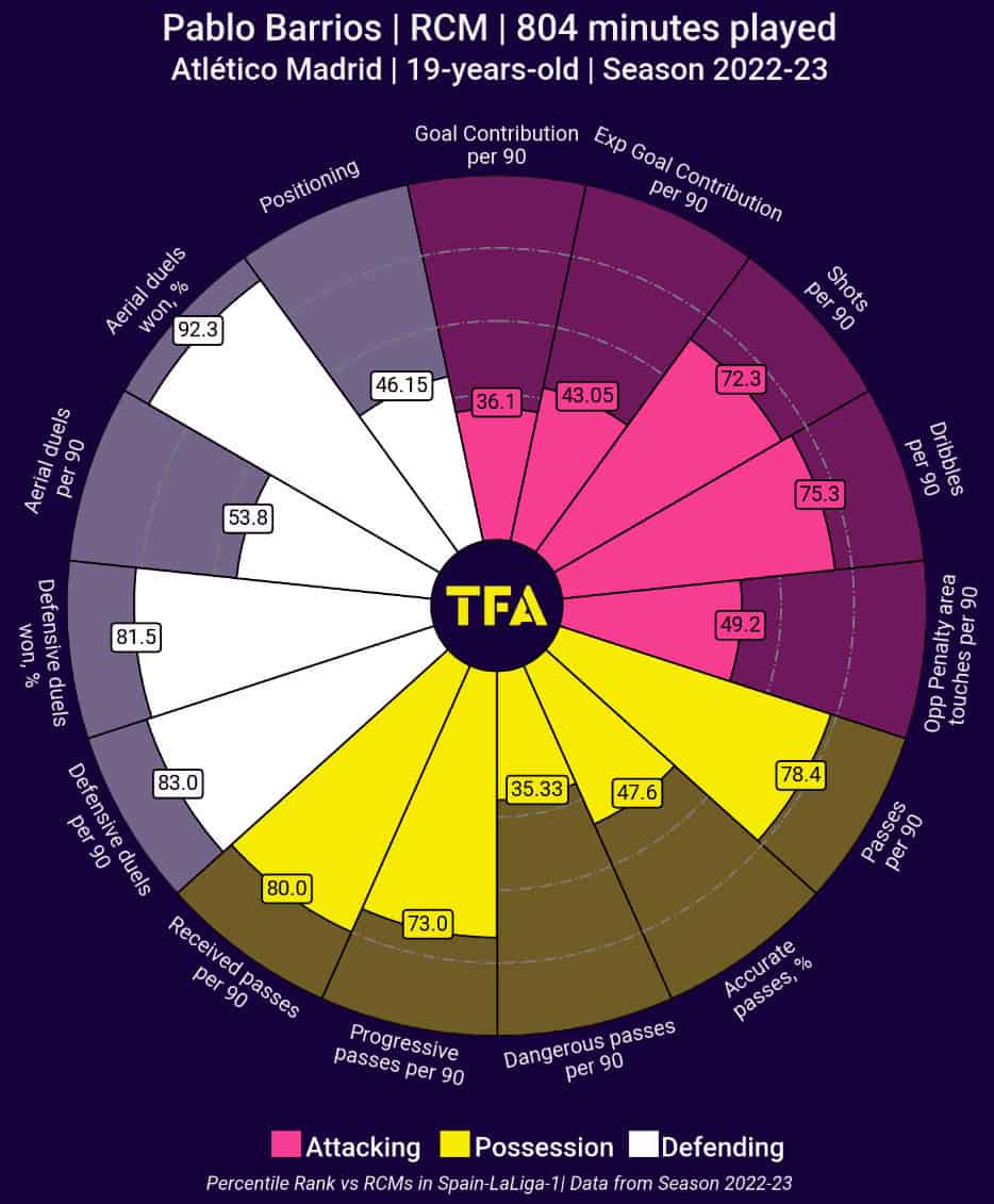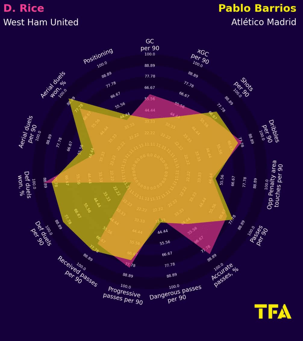 Using xGOLD, TFA’s very own player similarity tool, we have identified Atlético Madrid’s Pablo Barrios as a suitable replacement for Rice. Below is a radar showing their statistics next to each other. We can see how they are similar profiles, and rank close together for a number of different metrics. These include Dribbles per 90, Passes per 90, Progressive Passes per 90, and Defensive Duels Won (%).