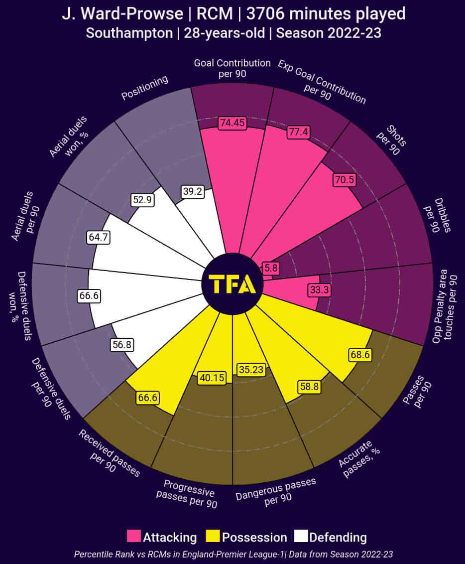 Another possible target West Ham could look to sign is Southampton’s James Ward-Prowse. Using the statistics from the below pizza chart, we can tell that Ward-Prowse would be an upgrade on Souček in terms of possessing the ball. He ranks fairly well at a number of possession metrics and gets through a lot of defensive work.