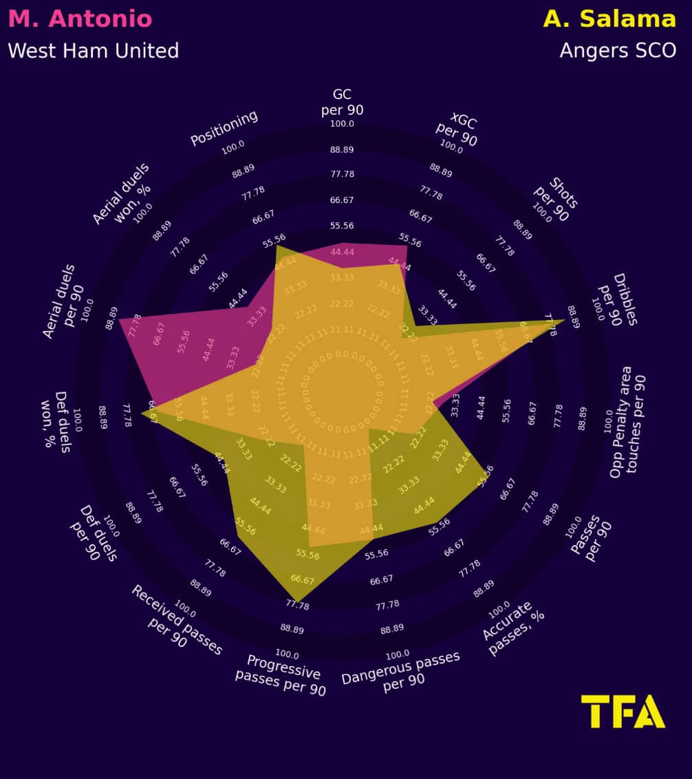 Lastly, we have used xGOLD to identify Amine Salama as a suitable replacement for Michail Antonio. Salama currently plays for Angers in Ligue 2, after their relegation from Ligue 1 at the end of the season – so he could be available at a reasonable price. Using the data from the below radar, we can see how the two players are very similar profiles. The only area where they differ is aerially. Antonio seems to attempt and win more aerial duels. Despite this the two players rank similarly at metrics like Goal Contributions per 90, Expected Goals per 90, Shots per 90, Opposition Penalty Area Touches per 90, and Dangerous Passes per 90.