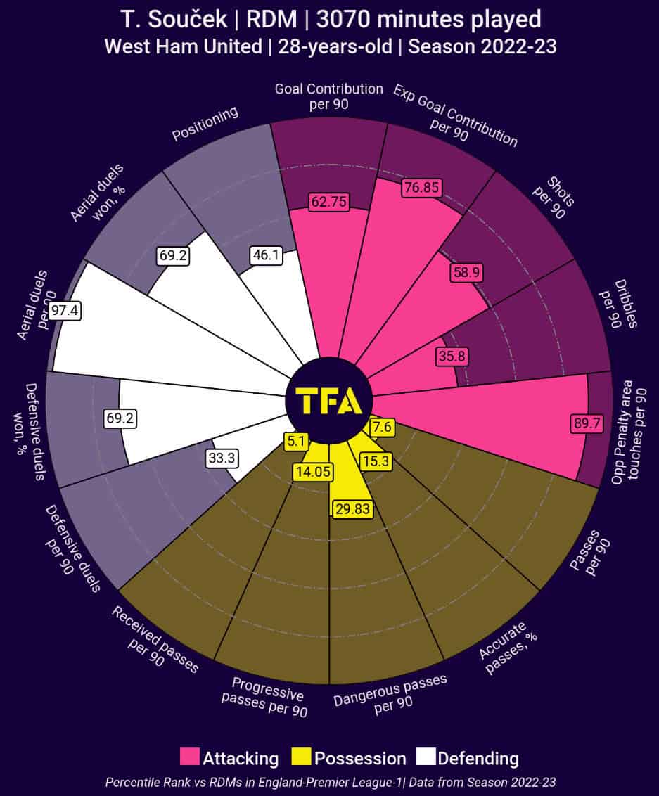 As earlier mentioned, Tomáš Souček wasn’t very effective at making progressive passes this season. In fact, when we look at his data using the pizza chart below, compared to other midfielders he ranks very poorly in a number of possession statistics. Souček does however rank well in metrics like Aerial Duels per 90, Aerial Duels Won (%), Goal Contributions per 90, Expected Goal Contributions per 90, and Opposition Penalty Area Touches per 90. This shouldn’t come as a surprise, as Souček plays a key part in ensuring West Ham are as effective from set pieces as they are. He also ranks well at Defensive Duels Won (%), which as earlier mentioned is important for West Ham as they require their midfielders to protect the defence when sitting in their low block.