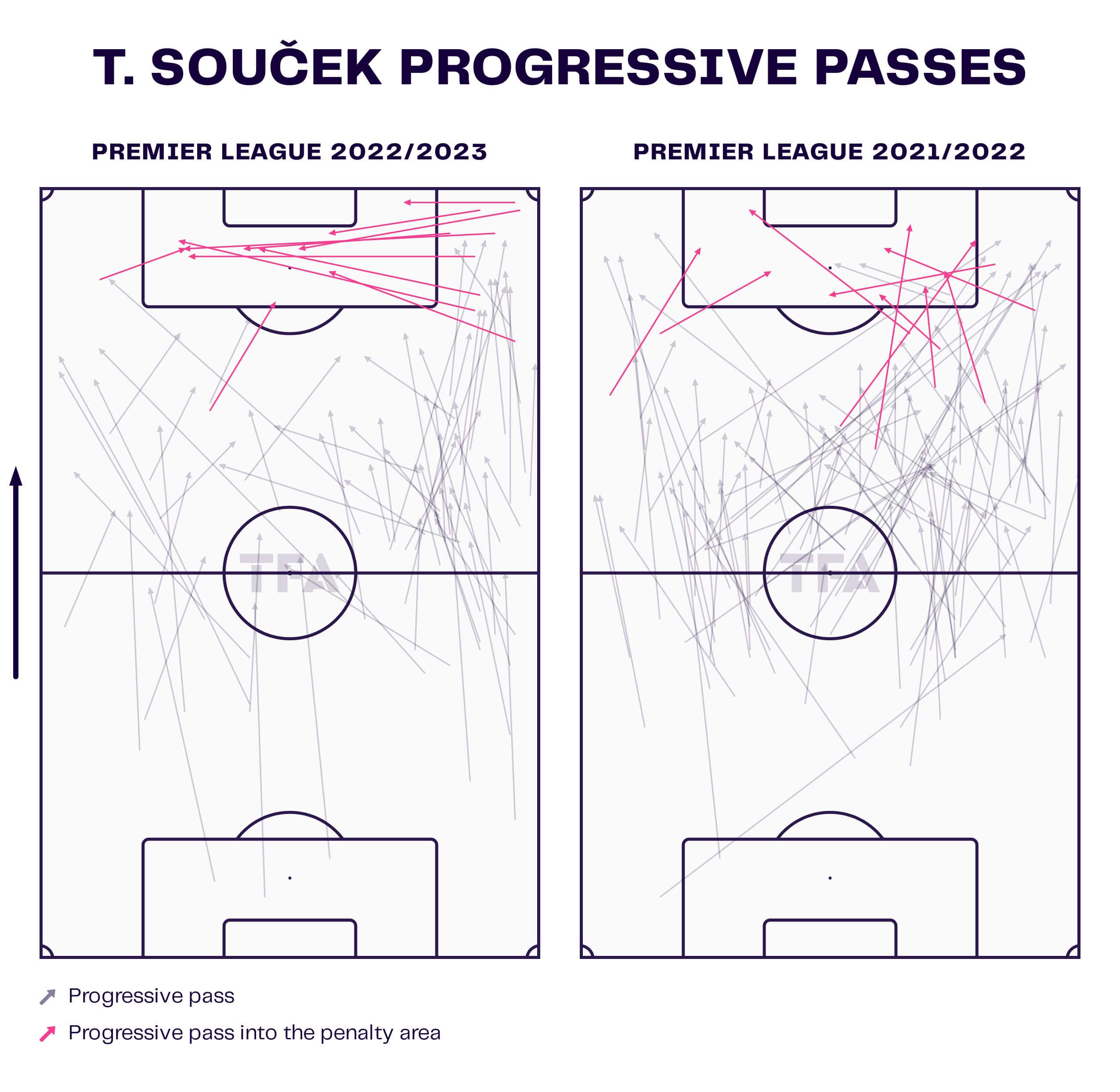 Below we can see Tomáš Souček’s progressive passes in both the 2021/22 and 2022/23 Premier League seasons for West Ham. We can clearly see how he made fewer of these passes in the most recent season. This put more pressure on captain and midfield partner Declan Rice to progress play from central midfield. With Rice seemingly close to leaving the club, West Ham will have to recruit in that area of the pitch.
